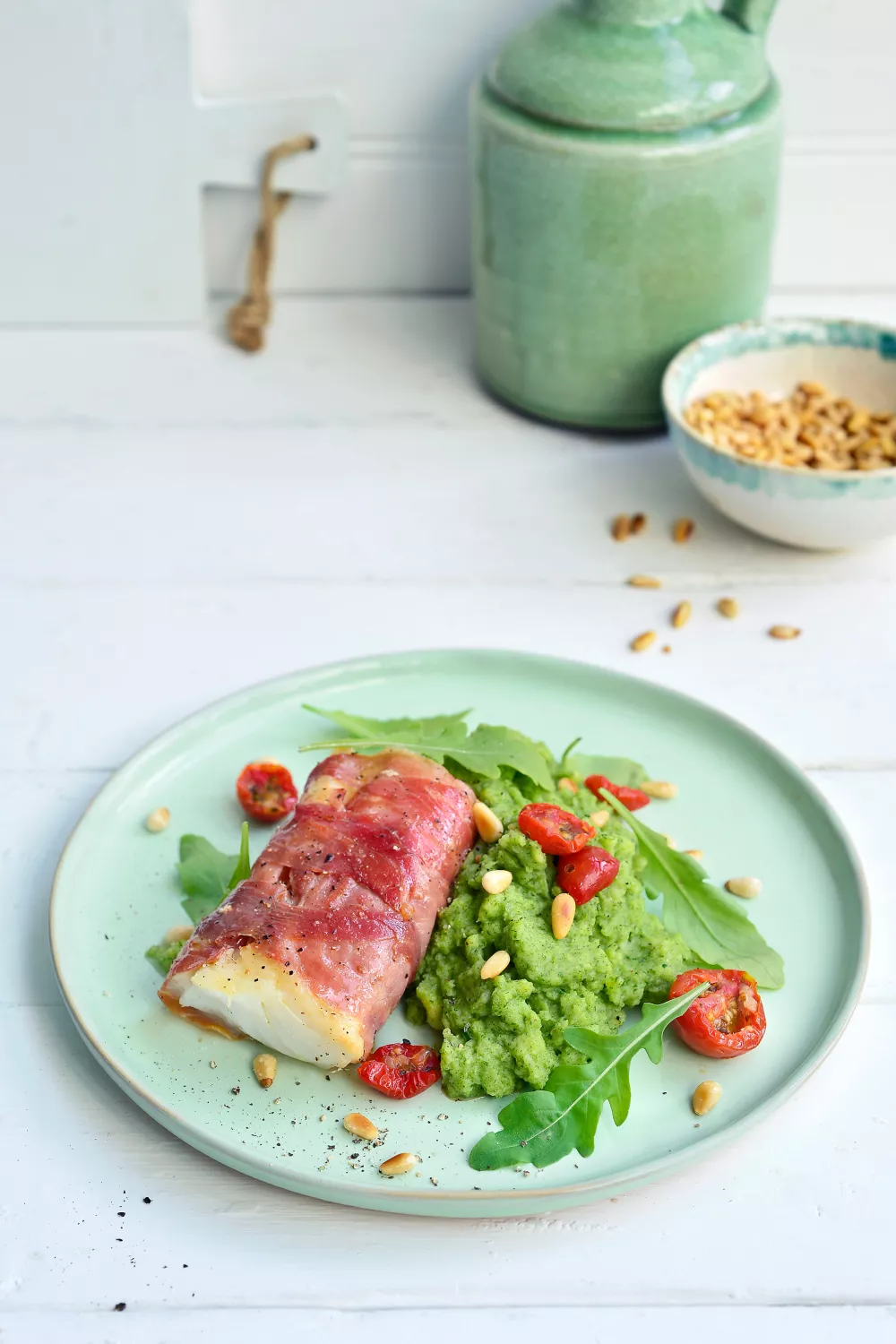 Stappenplan om recept “Kabeljauw in een jasje van ham met rucolapuree” te bereiden