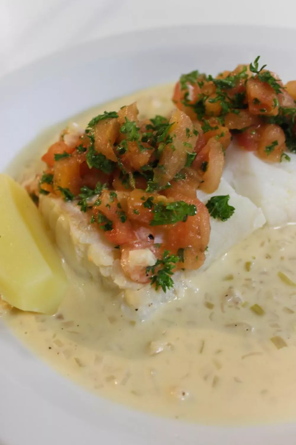Deze lichte kabeljauw met warme tomatenblokjes, een romige fumetsaus en gestoomde aardappelen brengt de frisse smaken van vis en zomergroenten samen. De vis wordt zachtjes gegaard in witte wijn en visfumet terwijl sjalotjes en room de saus rijk en zijdeachtig maken. Serveer als eenvoudig doordeweeks diner of als elegant gerecht voor gasten.