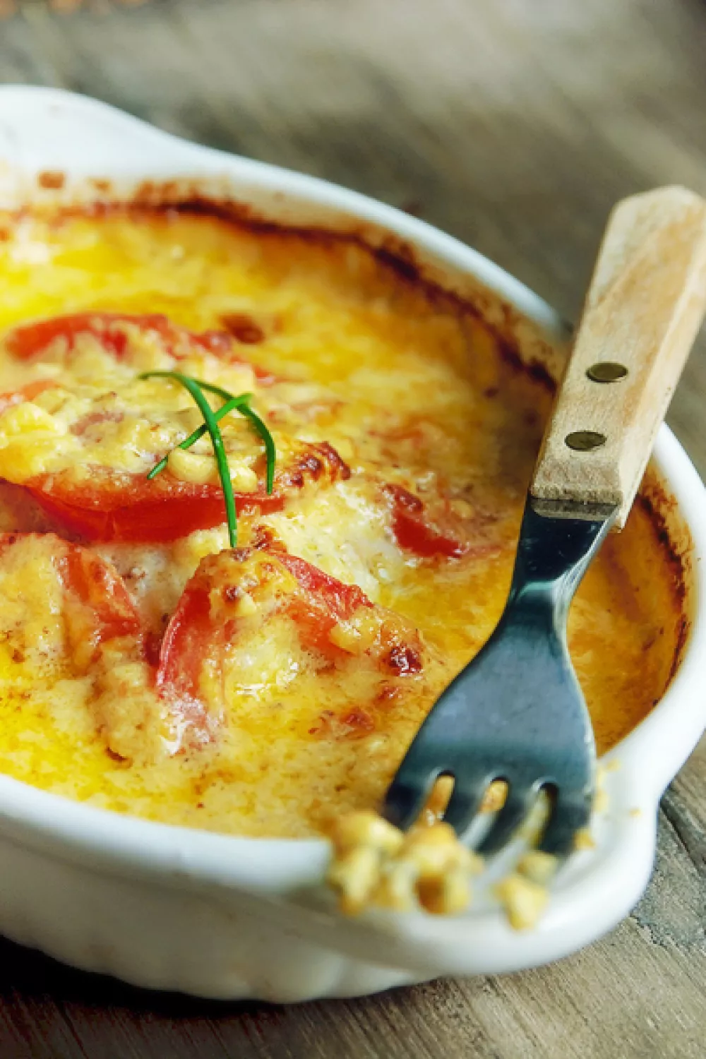 Malse kabeljauw met een hartige cheddarlaag en sappige roma tomaten, gebakken tot een goudbruine bovenkant in de oven. De romigheid van crème fraîche en de pittige touch van grove mosterd geven dit ovenvisgerecht een toegankelijke, bijna comfortfoodachtige smaak. Perfect als snelle doordeweekse maaltijd naast aardappelpuree en gestoomde broccoli of als lichte keuze in lente en zomer.