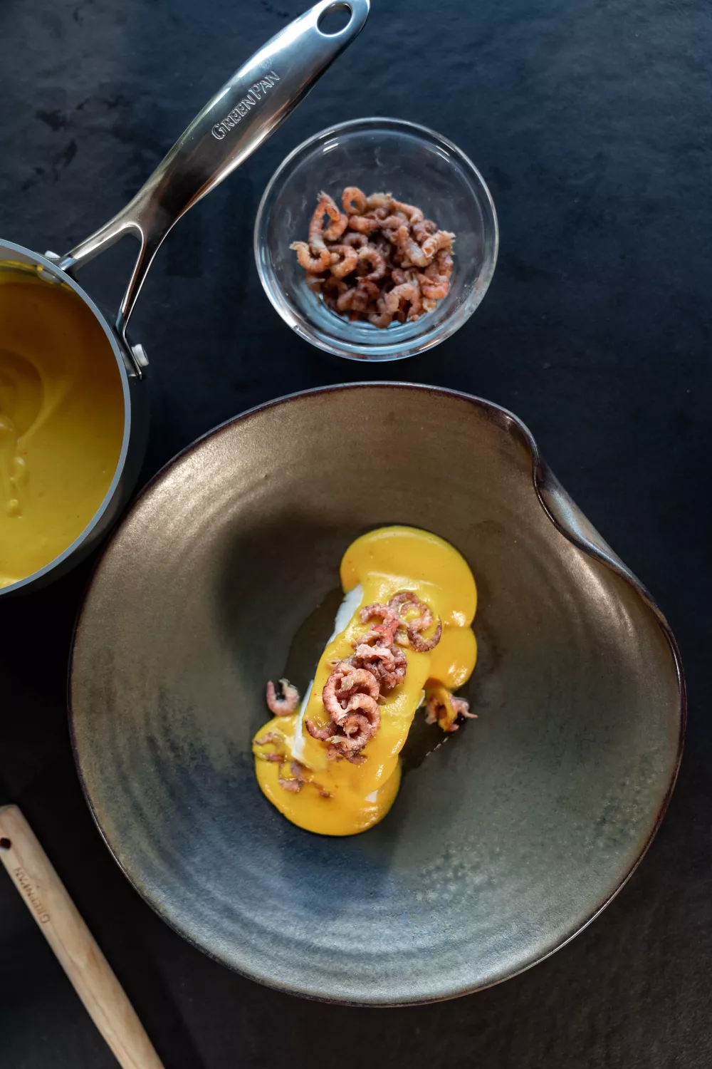 Schik de kabeljauw mooi op een bordje en lepel er de mousseline over. Werk af met gepelde grijze garnalen.