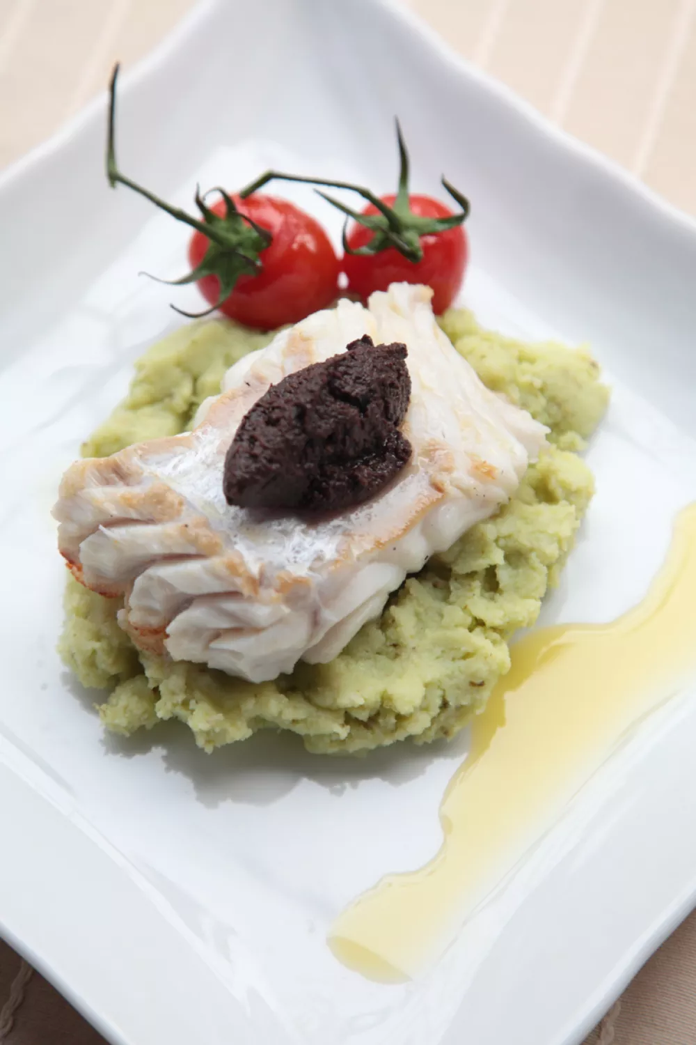 Leg de puree midden op het bord. Leg de vis op de puree en leg er een lepeltje tapenade op. Werk af met de trostomaatjes en enkele druppels olijfolie.