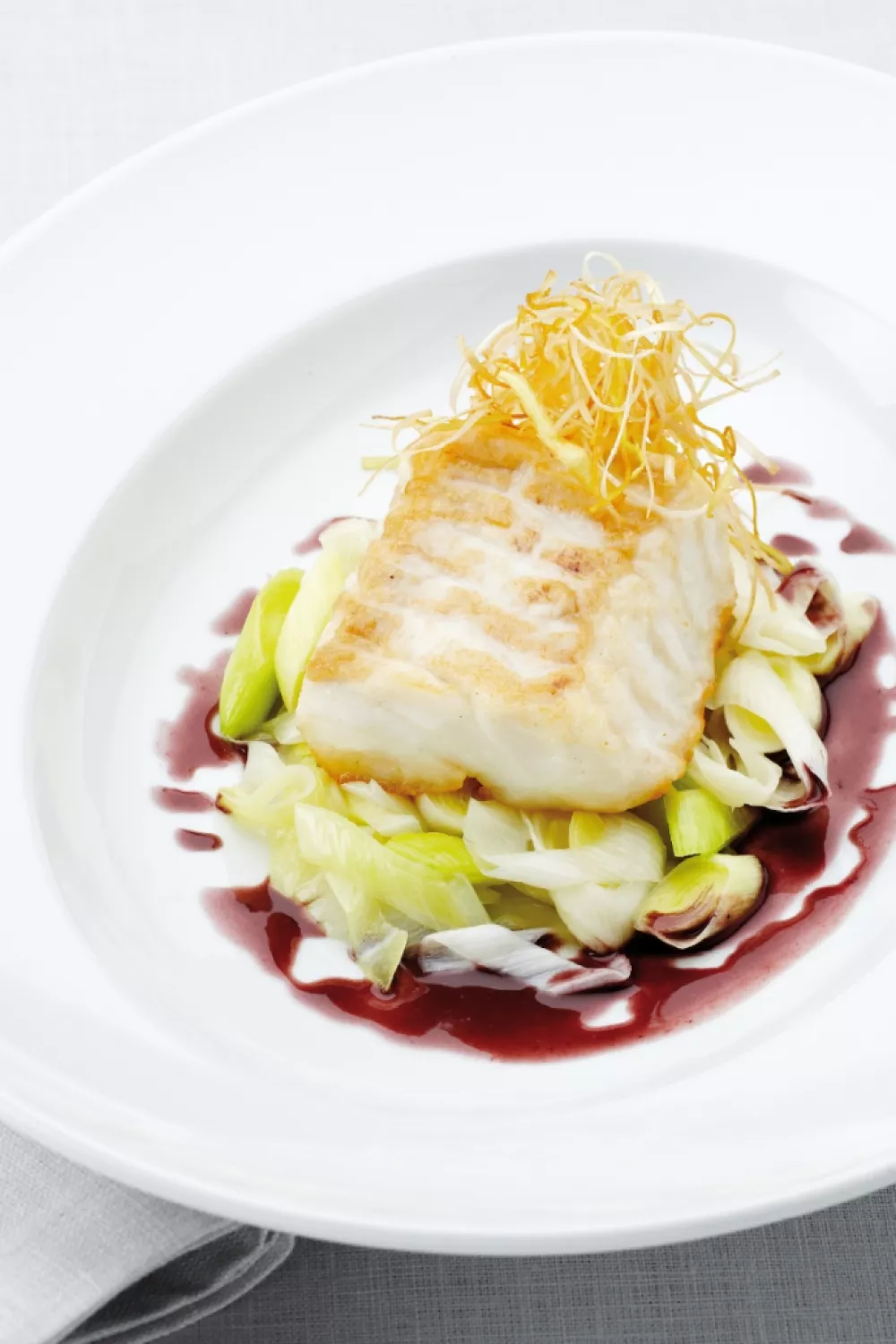 Schep de gestoofde prei op voorverwarmde borden en leg de vis erop. Werk af met de rode wijnsaus en gefrituurde prei.