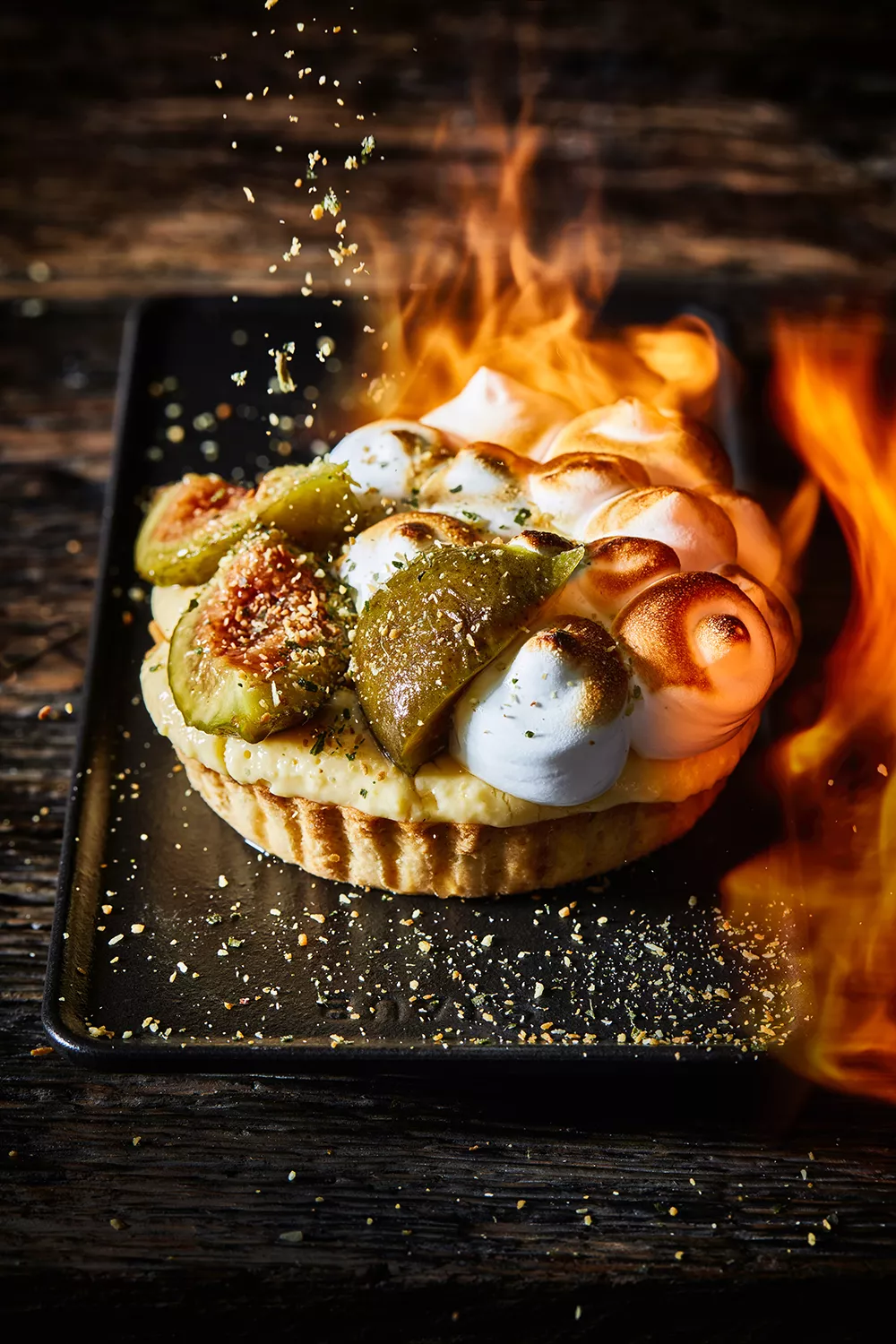 Snijd de vijgen in kleine partjes en zet ze opzij. Vul de afgebakken taartbodems met het kaffir lime-mengsel. Garneer met toefjes Italiaanse meringue, de gegrilde vijg en eventueel wat geroosterde kokossnippers.