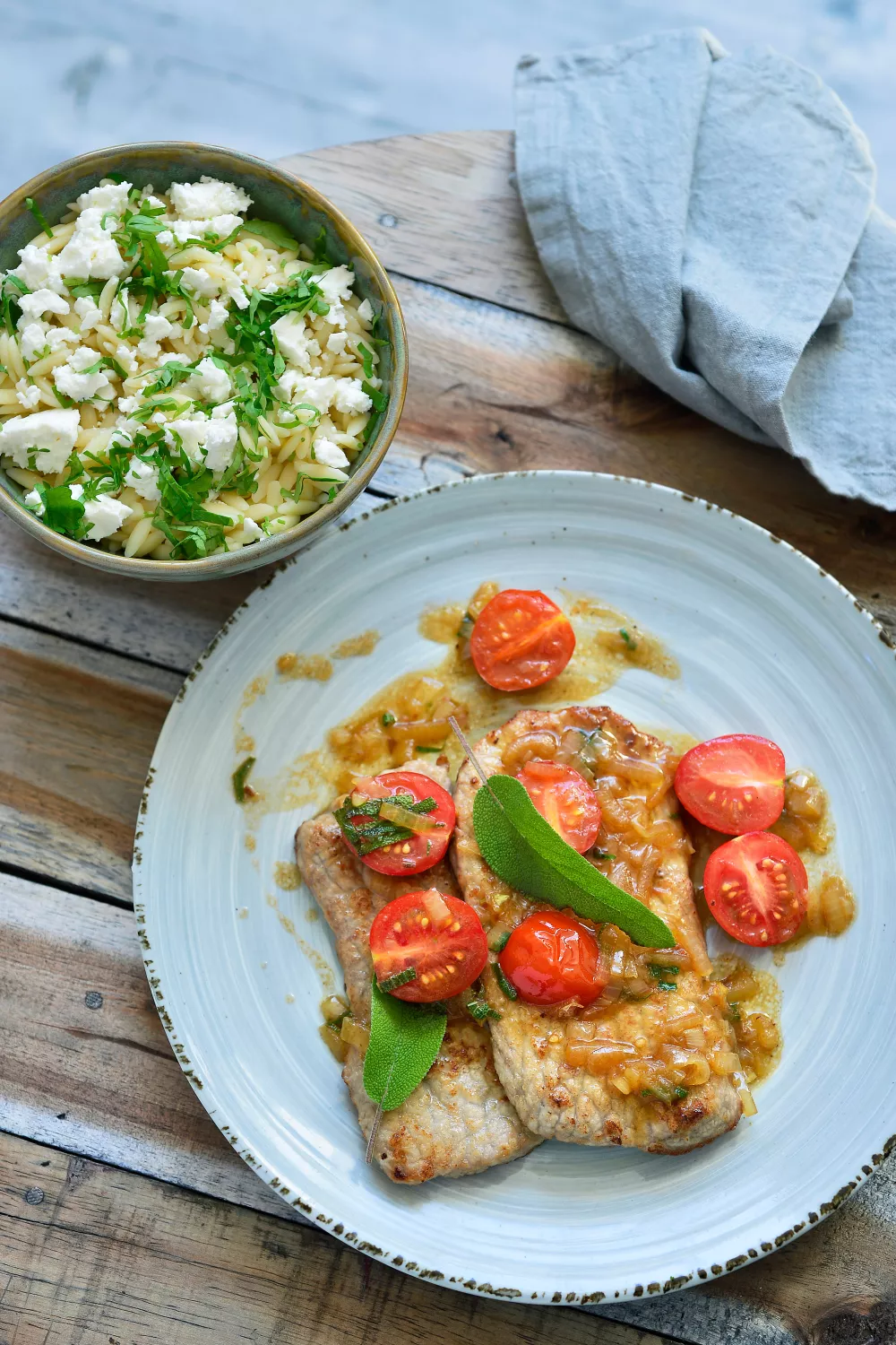 Kalfslapjes in citroensaus met Griekse pasta en feta