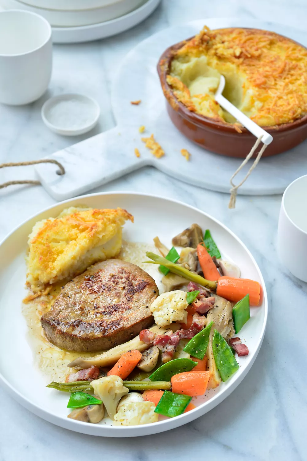 Een huiselijk gerecht met malse kalfslende, een mix van jonge wortels, sluimererwten, bloemkool en paddenstoelen en krokant spek voor diepe hartigheid. Romige aardappelpuree met Parmezaanse kaas wordt in de oven goudbruin gegratineerd. Perfect als verwarmend familiediner in lente of herfst, eenvoudig te bereiden in pan en oven.