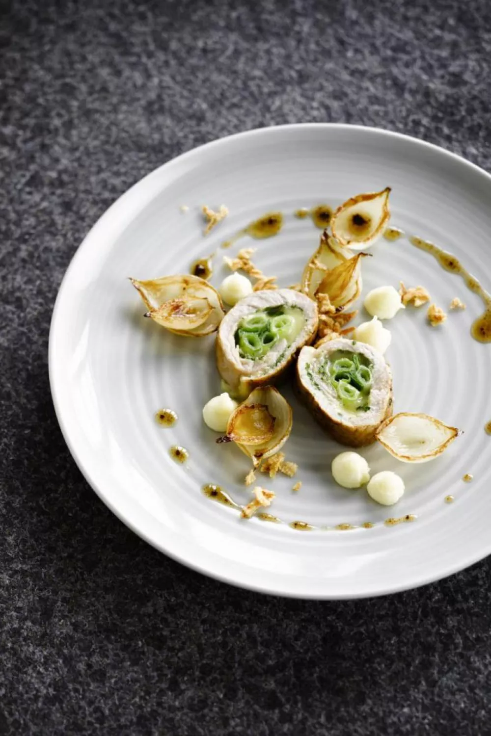 Bereid eerst de kalfsrolletjes. Leg de kalfslapjes tussen huishoudfolie en sla deze plat. Hak de peterselie, 3 blaadjes salie en knoflook fijn. Snij de lente-ui in even brede stukken als de kalfslapjes. Blancheer de lente-ui 5 minuten in kokend water met wat zout. Laat uitlekken.