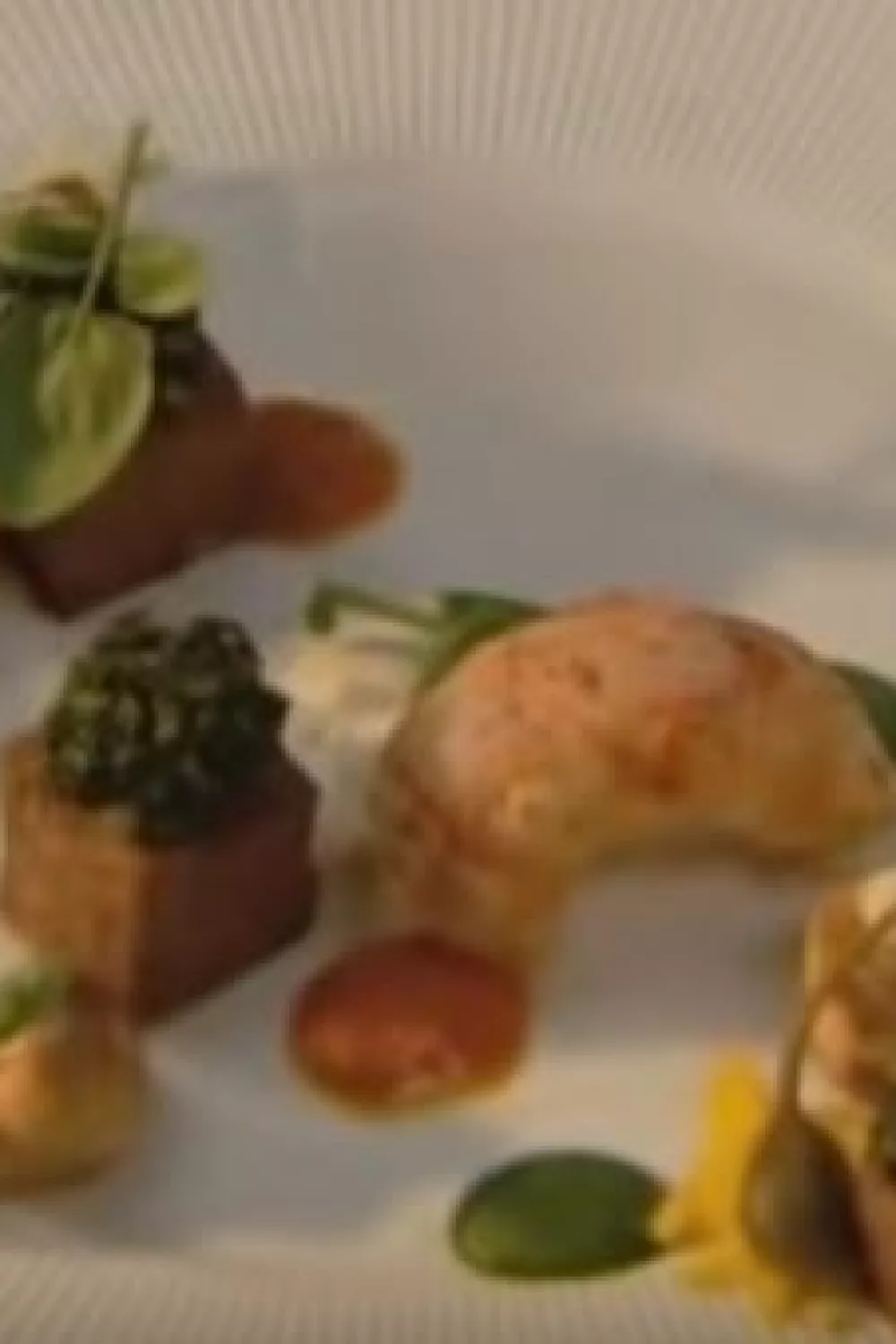 Een feestelijk, verfijnd bord waarin romige kalfstong en krokant gebakken kalfshersenen samengaan met gegrilde langoustines en een geconcentreerde tomatensaus. De bereiding combineert blanchen, bakken en plancha met ovengeroosterde tomaten en een huisgemaakte hersenmayonaise voor een rijke smaakbalans. Perfect als luxe voorgerecht of hoofdgerecht bij een bijzondere gelegenheid.