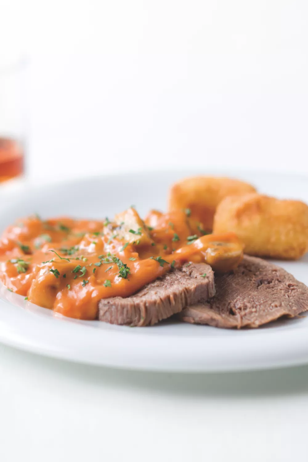Zachte kalfstong in een rijke madeirasaus met gebakken champignons en tomaat vormt de smaakvolle kern van dit klassieke, feestelijke hoofdgerecht. De tong wordt langzaam gesudderd, de saus gebonden met een roux en afgewerkt met madeira, terwijl kroketten van romige bintjes gepureerd, gepaneerd met panko en goudgeel gefrituurd worden voor een knapperige toets. Ideaal voor winterse diners en speciale gelegenheden.