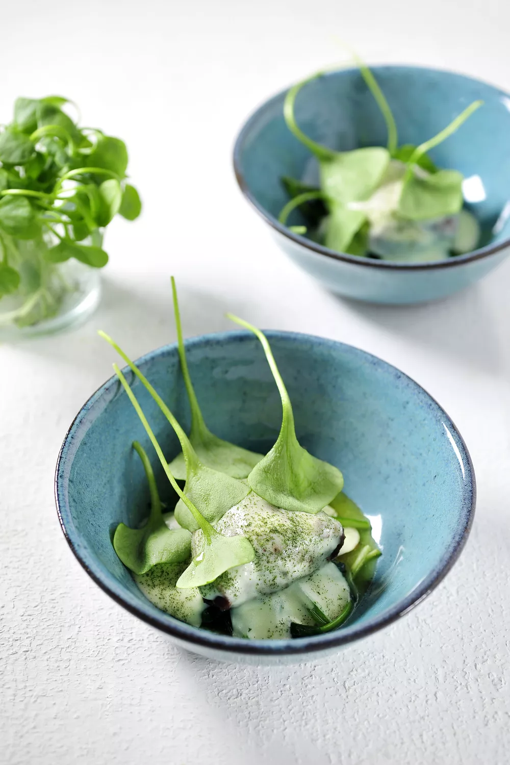 Kalfswangetjes met espuma van bloemkool en jonge spinazie