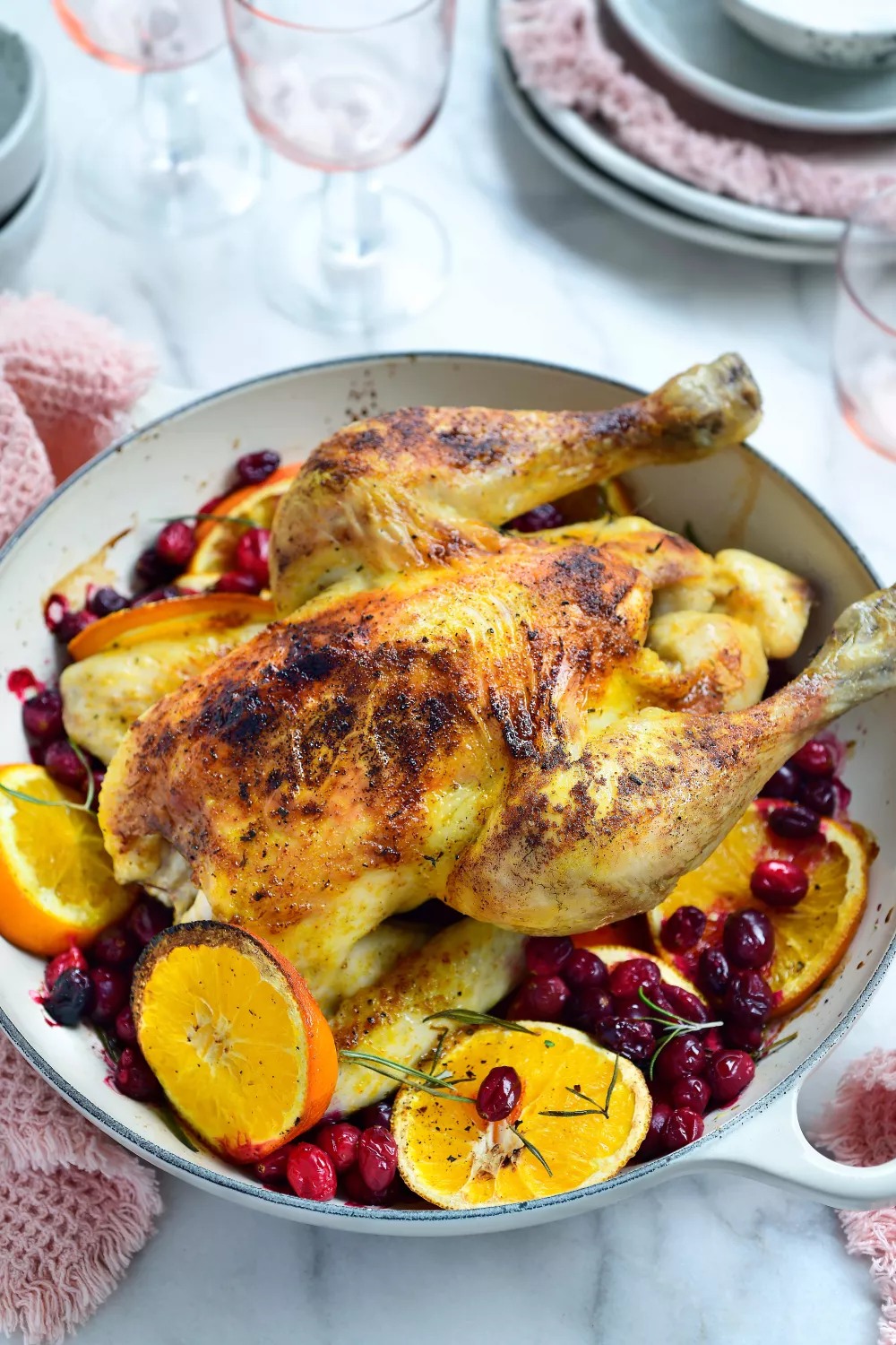 Een sappige kalkoen met sinaasappel, verse rozemarijn en veenbessen brengt citrusfrisheid en hartige kruiden samen voor een feestelijk ovengerecht. Door de sinaasappelschijfjes en een scheut olijfolie blijft het vlees mals en de veenbessen krijgen in de laatste 20 minuten een mooie zoetzure glans. Ideaal voor herfst en wintermaaltijden of een gezellige kersttafel.