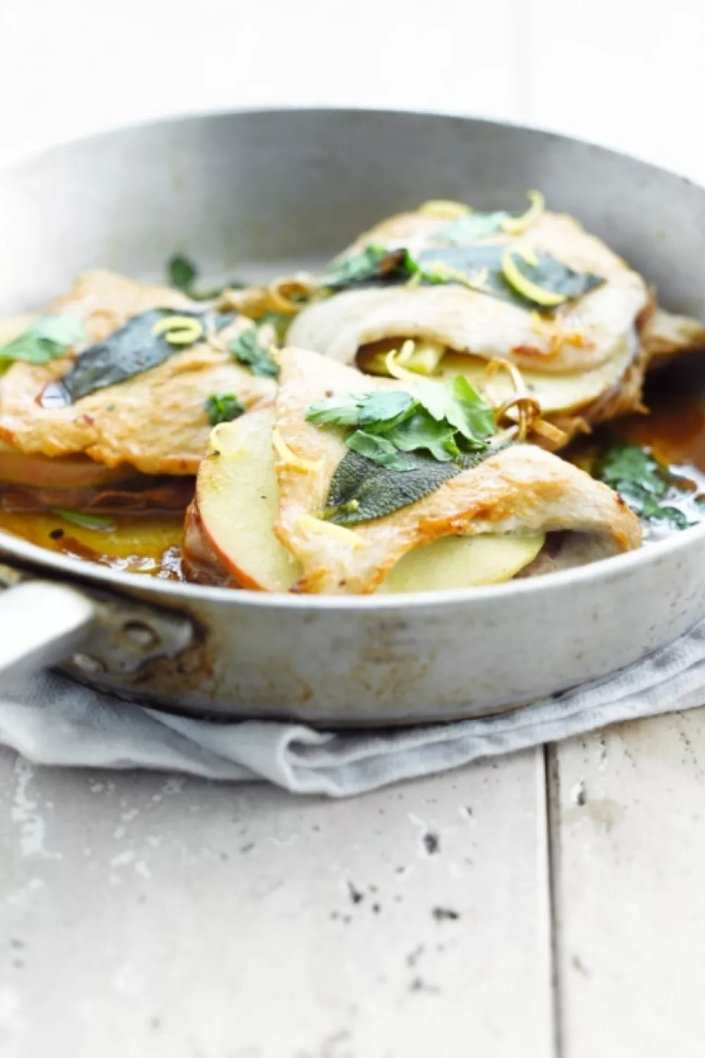 Leg op 1/2 van de kalkoenfilet een sneetje parmaham en een schijfje appel. Kruid met versgemalen peper en zout. Plooi de kalkoenfilet dicht, leg er een blaadje salie op en maak vast met een satéstokje.