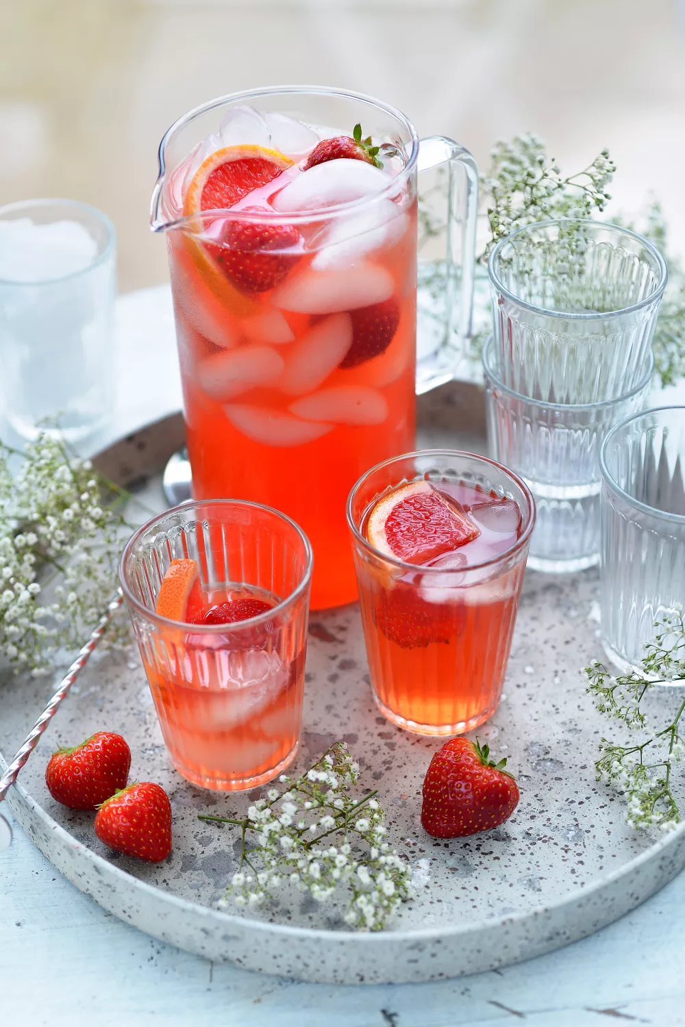 Serveer met verse aardbeien, schijfjes pompelmoes en ijsblokjes