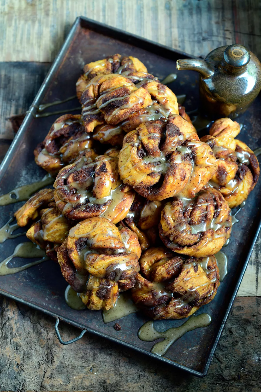 Smelt ondertussen voor de icing de boter met de ahornsiroop in een steelpannetje. Haal van het vuur en voeg de bloemsuiker en het koffiepoeder toe. Doe de vulling in een spuitzak en drizzle over de knots.