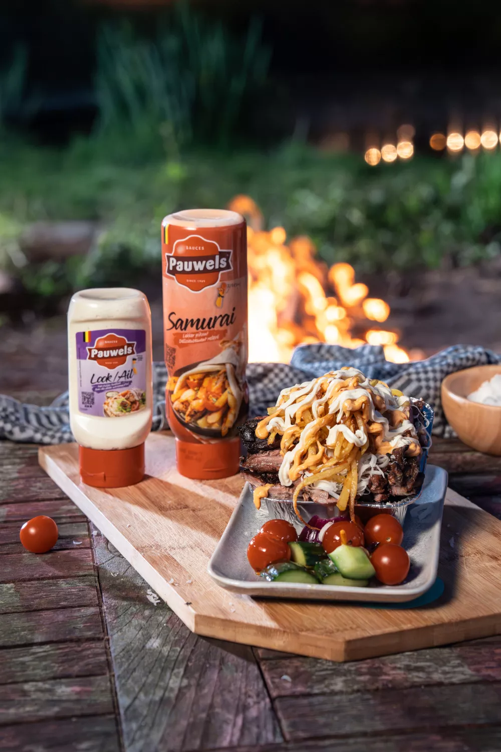 Deze open vuur kapsalon combineert malse lamsbuik gemarineerd in Griekse yoghurt, geroosterde koriander en za'atar met knapperige frietjes en rokerig gegrilde groenten. Het vlees wordt aan een spies geroosterd boven de vlammen en afgewerkt met Parmezaanse kaas en pittige sauzen voor een rijke, hartige smaak. Perfect voor een zomerse barbecue of een gezellig, informeel etentje waarbij grillen en frituren samenkomen.