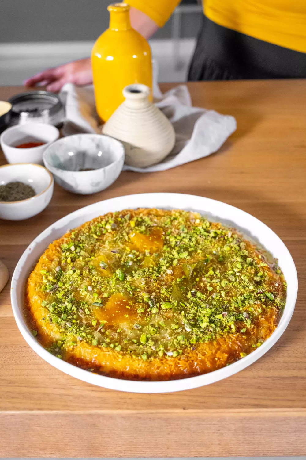 Haal de knefe uit de oven en draai ‘m om op een bord. Lepel er de suikersiroop over en werk nog af met de fijngemalen pistachenootjes.