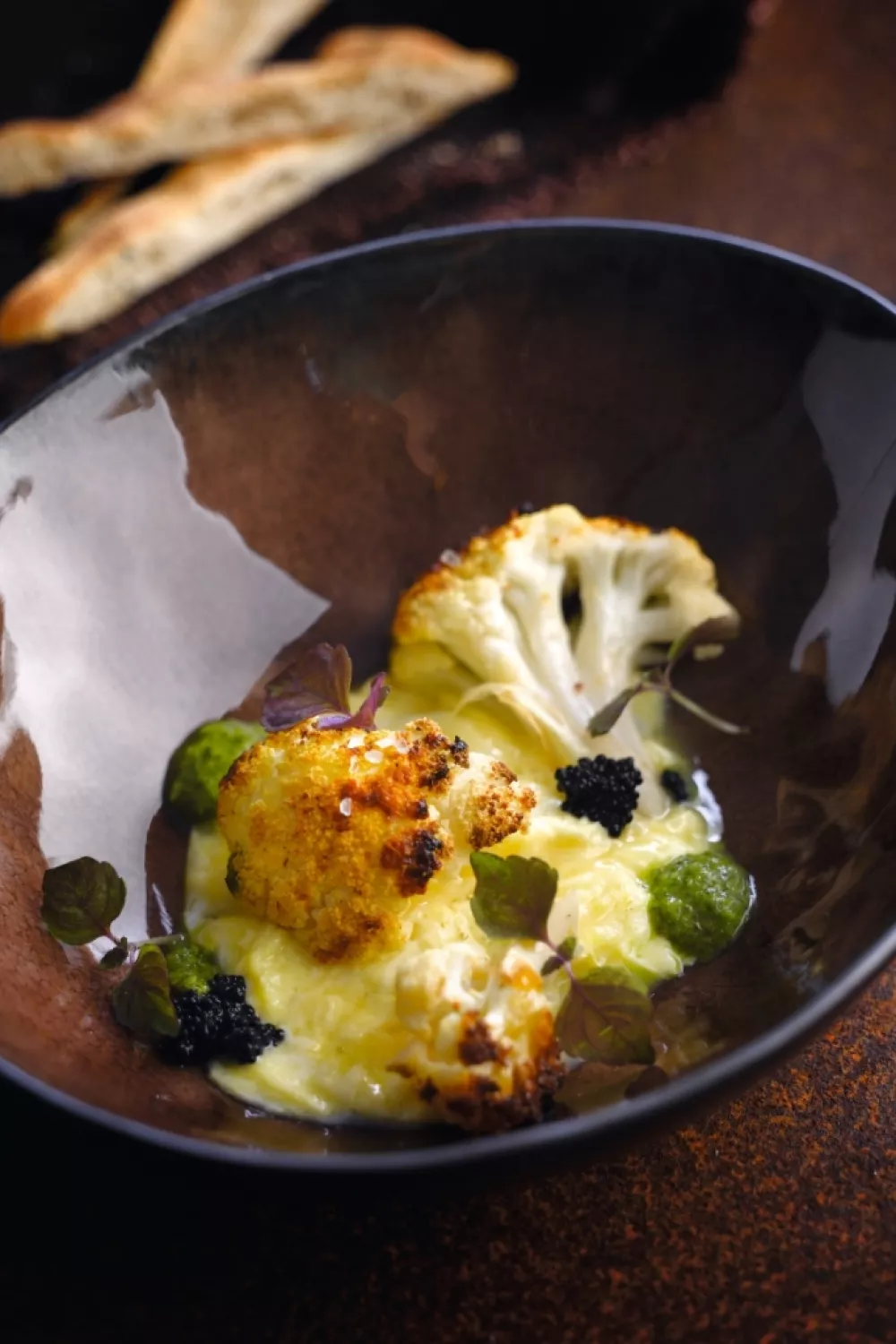 Serveer de geroosterde bloemkool met de muntcoulis, het roerei en de kaviaar. Dien eventueel op met geroosterd naanbrood en cress.