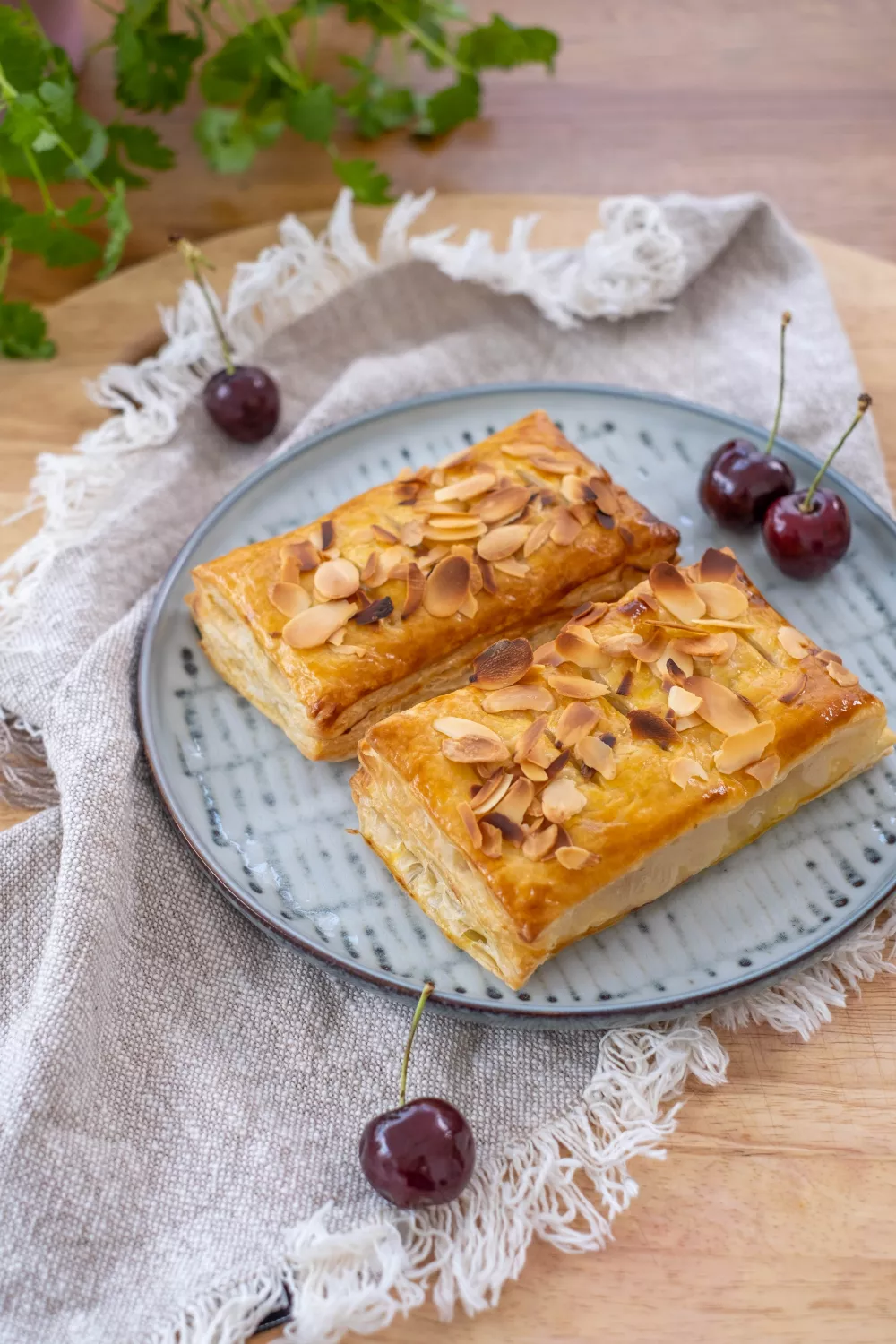 Luchtige kersenflappen met romige vanillepudding en krokante amandelschilfers, ideaal als zoet tussendoortje bij koffie of brunch. De kersen worden zacht gestoofd in suiker en samen met pudding in krokant bladerdeeg gevouwen en goudbruin gebakken. Snel te maken met kant en klaar bladerdeeg en perfect voor lente en zomer of een gezellig feestje aan de koffietafel.