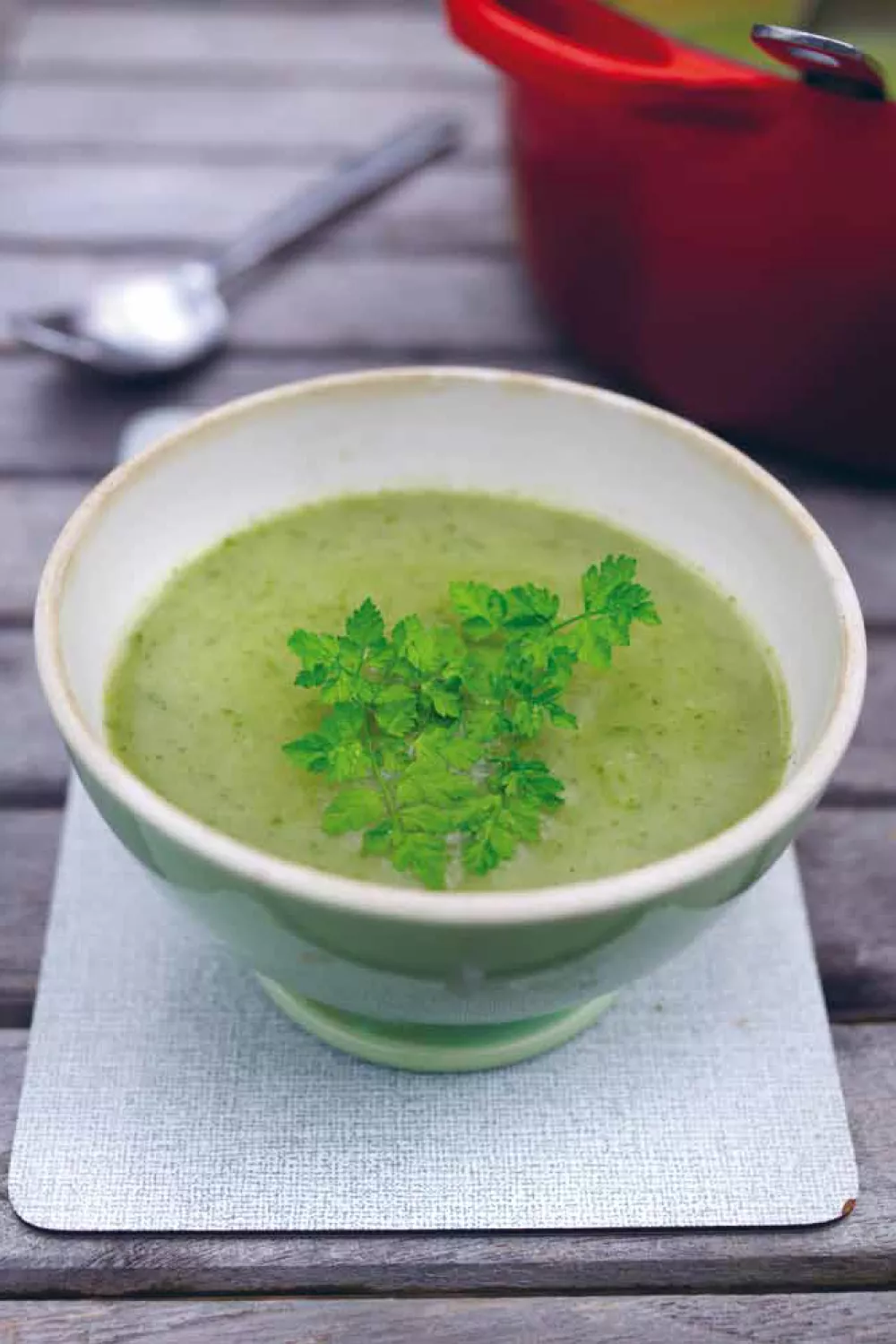 Voeg er op het einde de andere helft van de kervel aan toe, zo krijg je een mooie groene soep.