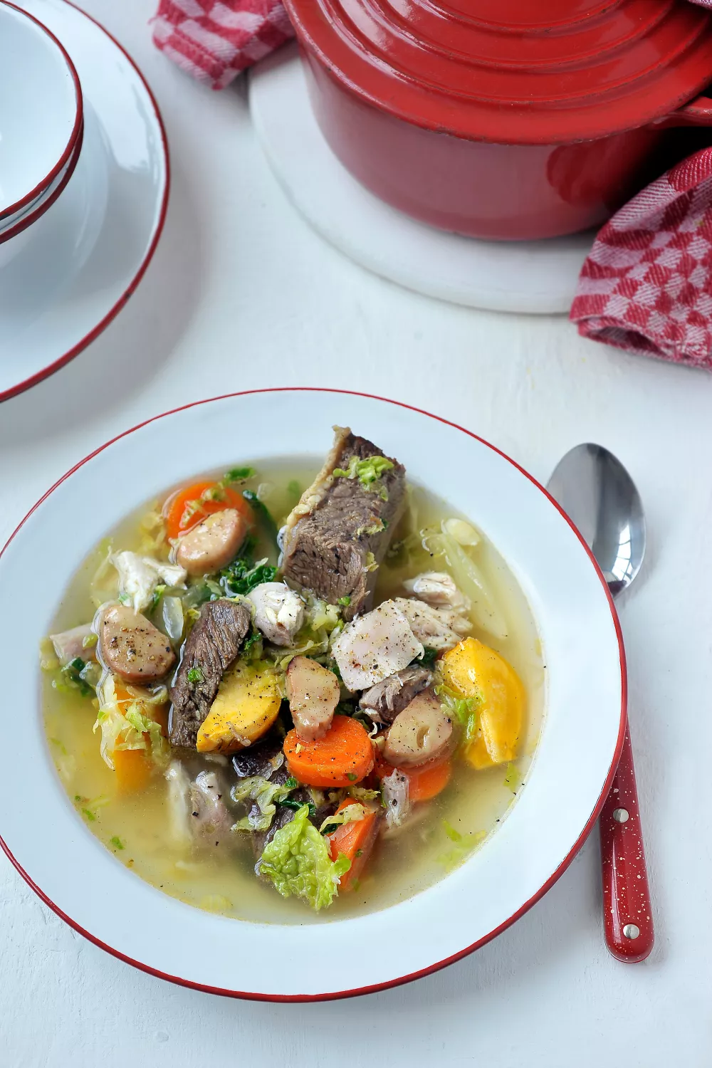 Een hartverwarmend keteltje met rundsvlees, kip en knapperige groentjes in een heldere kippenbouillon, ideaal voor koude winterdagen of een gezellig familiediner. Het vlees suddert urenlang in de bouillon zodat de smaken diep doordringen, terwijl fijn gesneden prei, selder en wortel hun textuur en kleur behouden. Kleine plakjes beendermerg worden kort gepocheerd en vormen een rijke, elegante afwerking van deze klassieke soep.