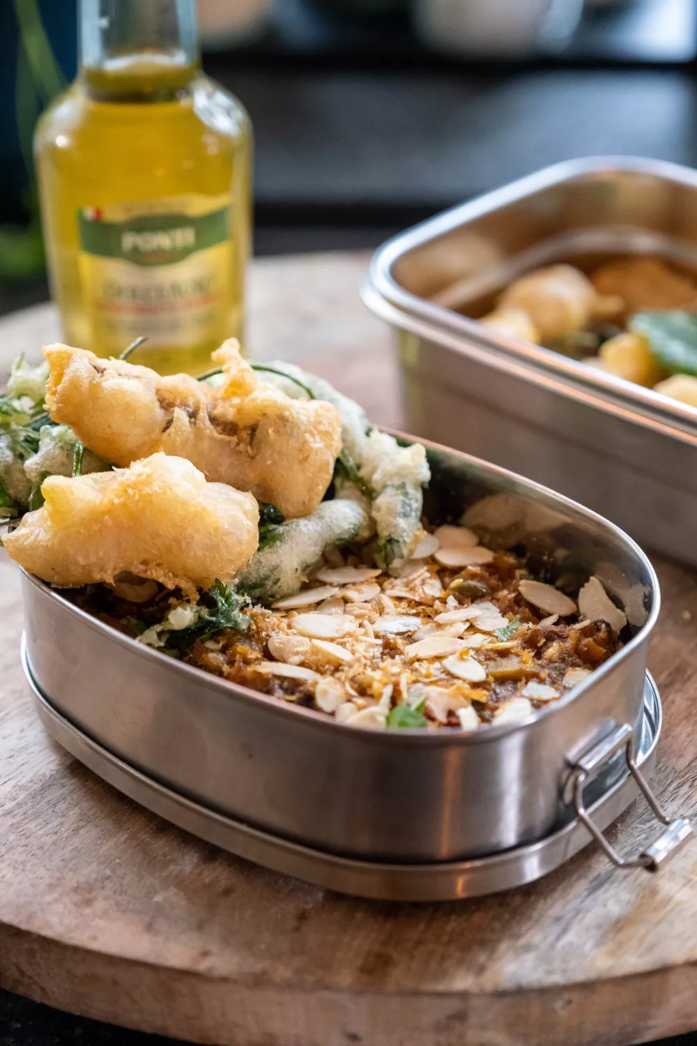 Knapperige kibbeling van wijting in luchtig tempurabeslag, geserveerd met een geurige caponata van aubergine, tomaat en kappertjes en afgewerkt met panko en amandelschilfers. De vis wordt snel gefrituurd tot goudbruin en krijgt frisheid van citroenzeste, terwijl de caponata zachtjes karamelliseert met ui, selder en een scheut Agro Dolce. Ideaal als zomerse borrelhap of relaxed avondmaal vol Mediterrane smaken en texturen.