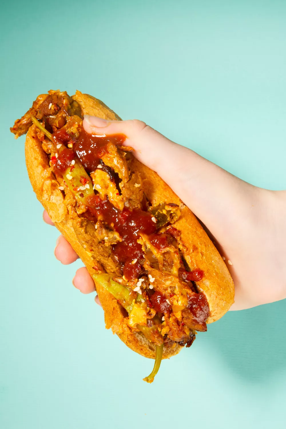 Snijd de broodjes open – wij hebben een voorkeur voor een zacht Subway-stijl broodje, maar die zijn lastig te vinden – en leg ze eventjes op het stomende vlees. Hierdoor trekt de smaak er lekker in en wordt het brood ook wat zachter. Na een halve minuut is het klaar en kun je het broodje met het vlees, de kimchi, pepers en kaas van de bakplaat (of uit de pan) halen en dichtvouwen met de vulling ertussen.