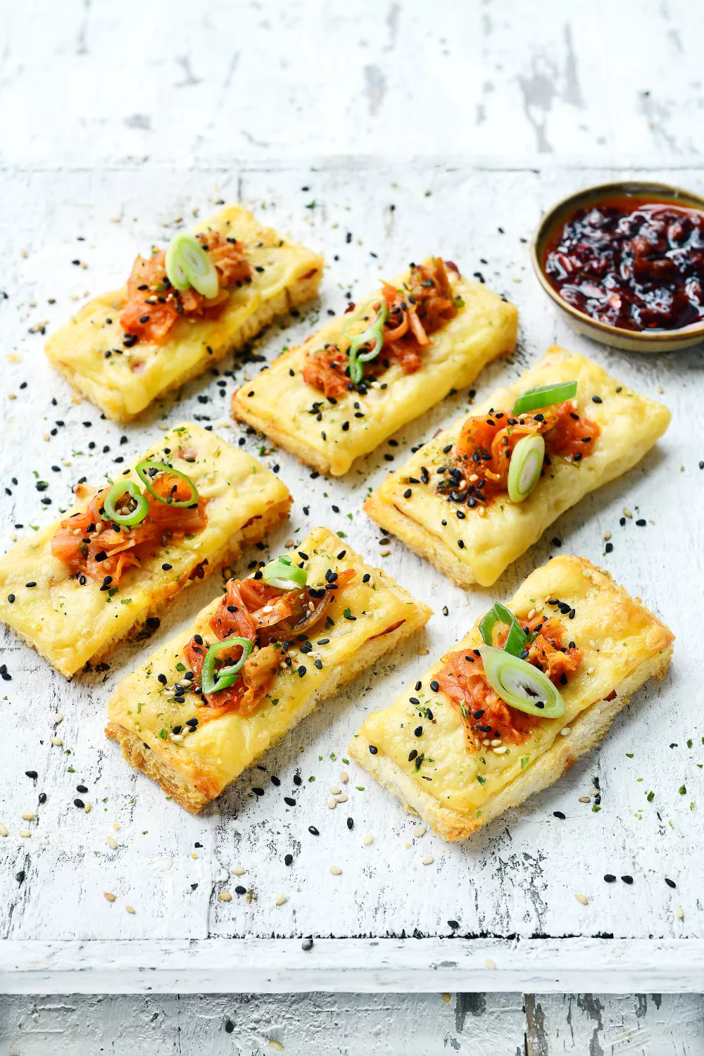 Een Aziatisch geïnspireerde tosti met gesmolten belegen kaas, sappige beenham en pittige kimchi voor een verrassende umami kick en crunchy toets. De mini tosti’s maak je snel in de oven door boterig casinobrood te beleggen met ham, kaas en togarashi en goudbruin te bakken tot de kaas gesmolten en goudbruin is. Met lente-ui, zwarte sesam en krokante chiliolie als dip zijn ze perfect als borrelhap, snelle lunch of comfortfood voor elk seizoen.