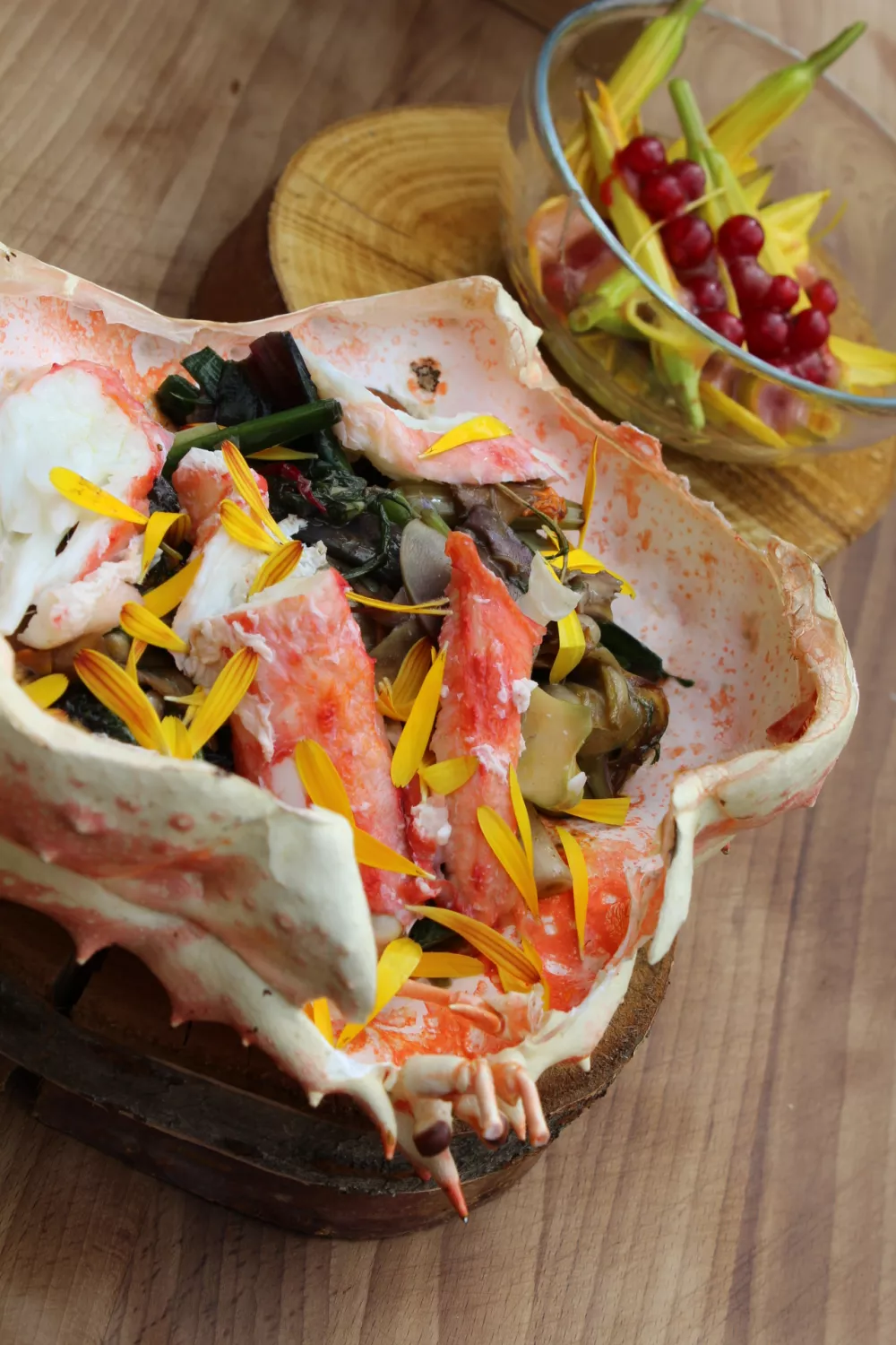 Een verfijnd bord met kingkrab en knapperige jonge groentjes, waarin zoete bisque en delicaat espressoschuim de smaken verdiepen. Dunne plakjes met de mandoline en kort gebakken mini venkel, wortel en raapjes zorgen voor frisse textuur, terwijl umeboschi, zwarte sesampasta en lichte sojasaus de dressing diepe umami geven. Perfect als elegant voorgerecht of hoofdgerecht bij een lente of zomerdiner, ideaal wanneer je wilt imponeren met moderne verfijnde technieken en afwerking met eetbare bloemen.