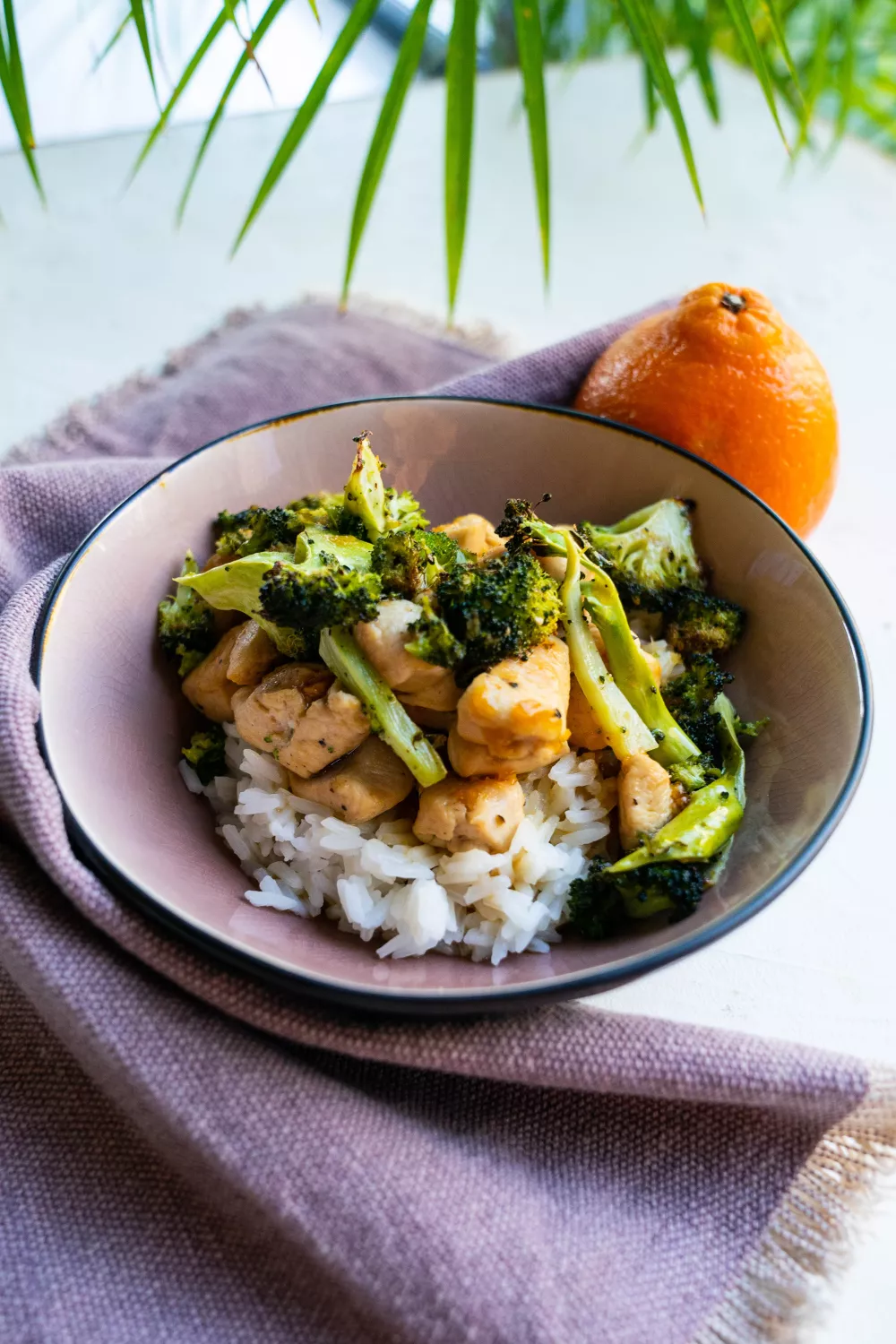 Serveer de kip samen met de sinaasappelsaus, de broccoli en de rijst.