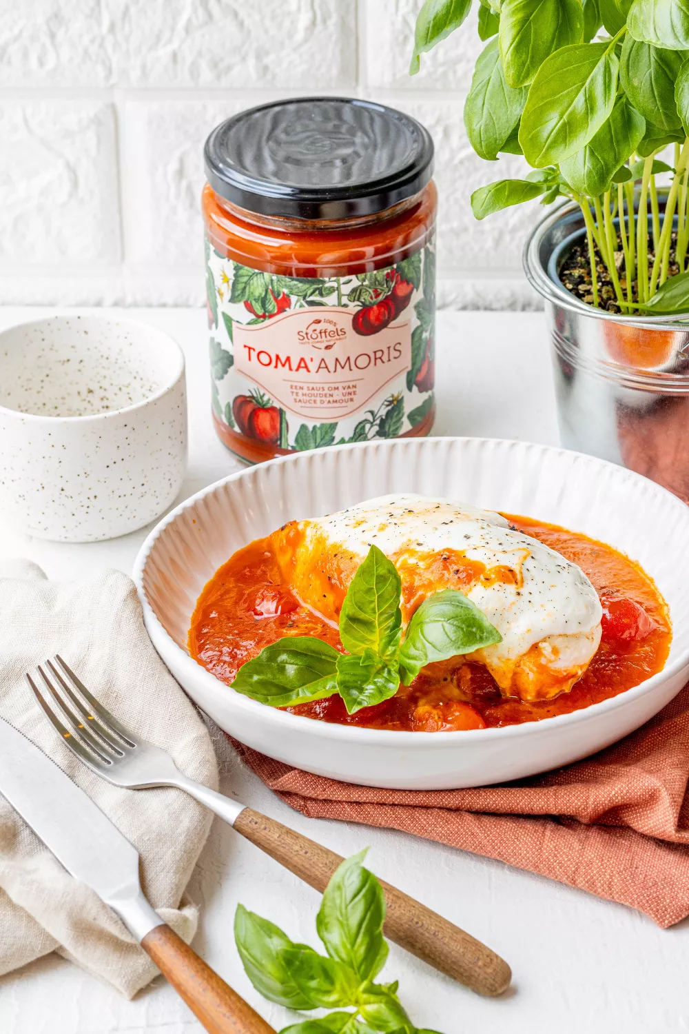 Giet de Toma’amoris langs de kipfilets in de schotel samen met de kerstomaten.Beleg de filets met plakjes mozzarella en laat 15 minuten pruttelen op het vuur, met het deksel op de pan.Werk af met verse basilicum.