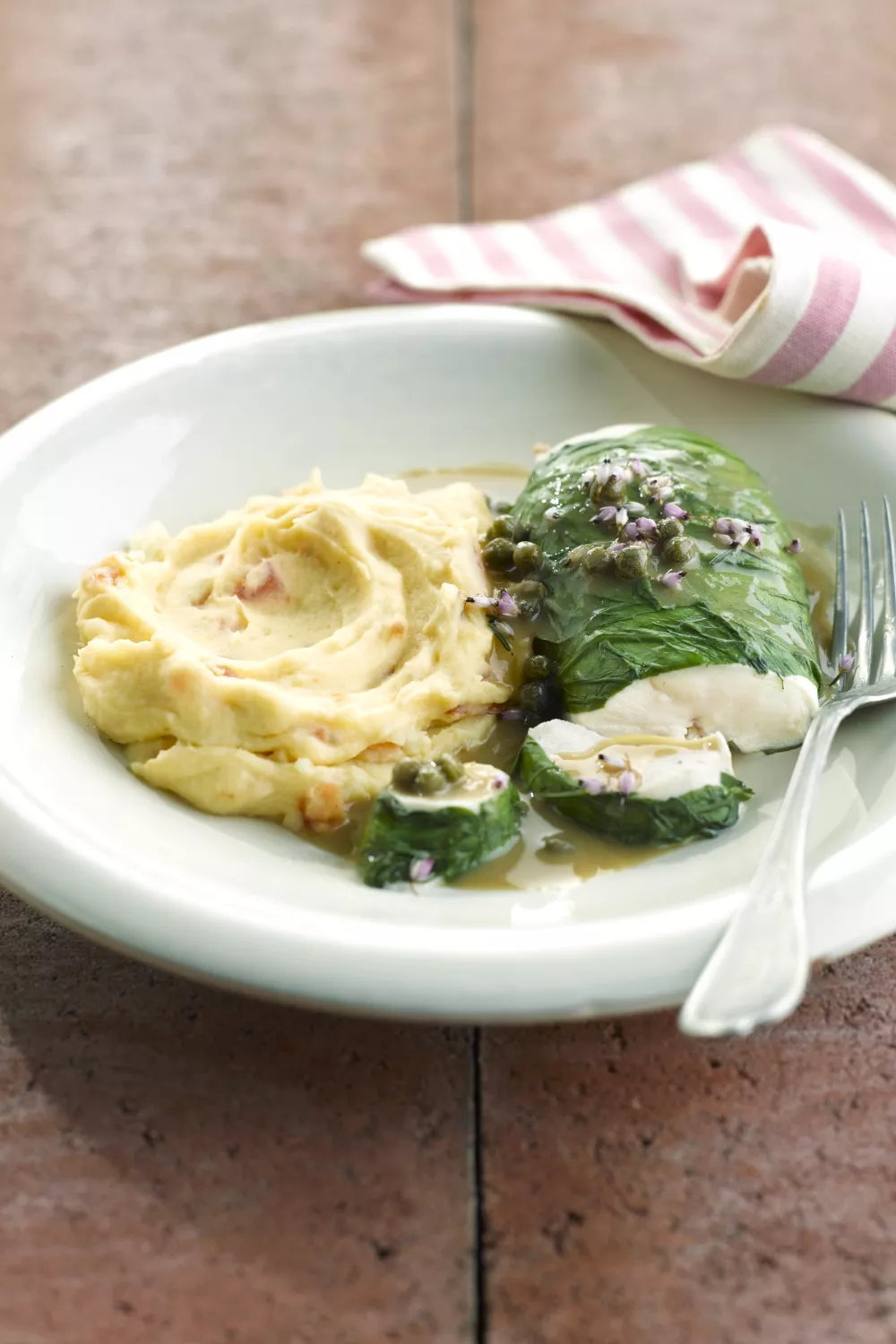 Malse kipfilets worden omwikkeld met grote basilicumblaadjes en stoomgaar bereid boven een aromatische sherrybouillon, geserveerd met romige aardappelpuree met tomaat. Een zilte ansjovis-kappertjessaus op gesmolten boter geeft het gerecht frisheid en pit. Ideaal als lichte zomerse lunch of elegant diner in lente en zomer.