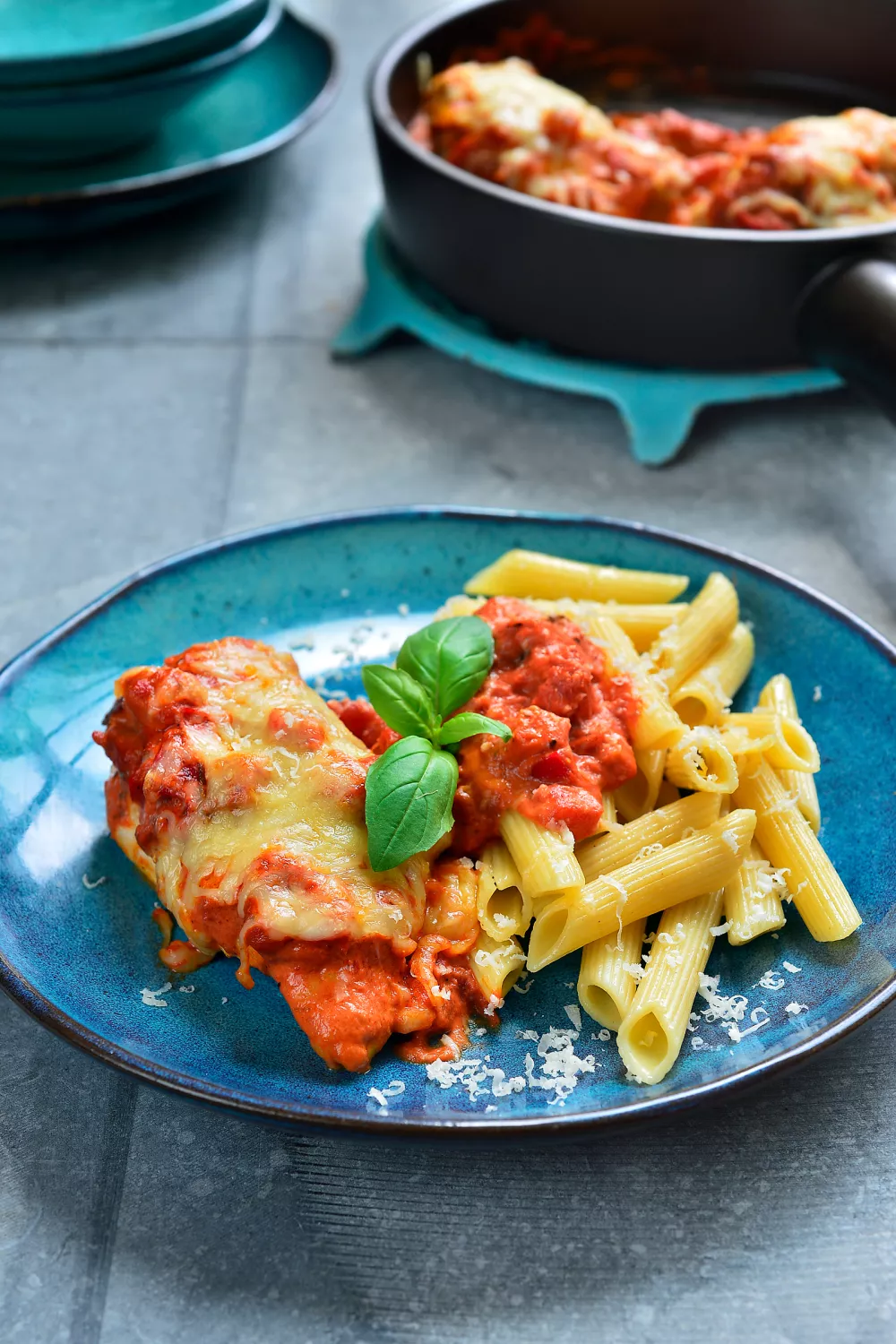 Serveer de kip met de tomatensaus en de penne. Werk af met een takje basilicum.