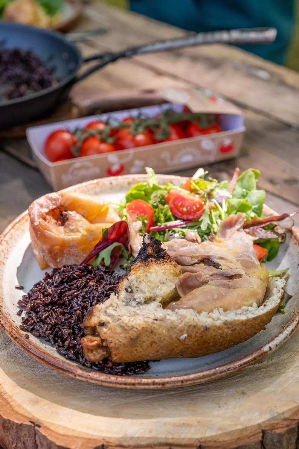 Barbecuekip in een knapperige zoutkorst, gevuld met ui en rozemarijn, krijgt gezelschap van in klei gegaarde appels met gember en kaneel voor een warme, rokerige smaak. Serveer met zwarte rijst, frisse veldkruiden en geroosterde tomaatjes voor een feestelijke, rustieke maaltijd vol contrasten in textuur en aroma. Perfect voor buiten koken met vrienden in het late voorjaar of de zomer.