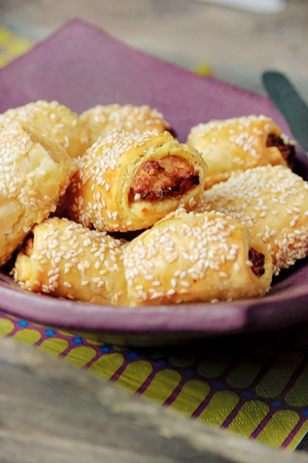 Klopt het tweede ei los en bestrijk de bladerdeeg rolletjes ermee. Besprenkel ze met de sesamzaadjes.