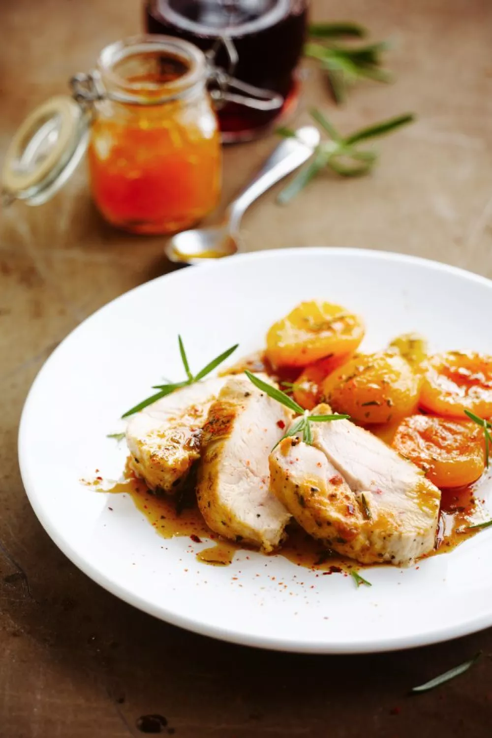 Mals gebakken kipfilet in een glanzende abrikozenjus met verse abrikozen, abrikozenconfituur, chilivlokken en rozemarijn zorgt voor een heerlijk zoet en pikant samenspel. Door de kip kort te bakken en het braadvocht te blussen met kippenbouillon ontstaat snel een smaakvolle saus, ideaal voor een lichte zomerse maaltijd of een snelle doordeweekse avondmaaltijd. Serveer met een frisse salade, geroosterde groenten of couscous voor extra textuur en kleur.