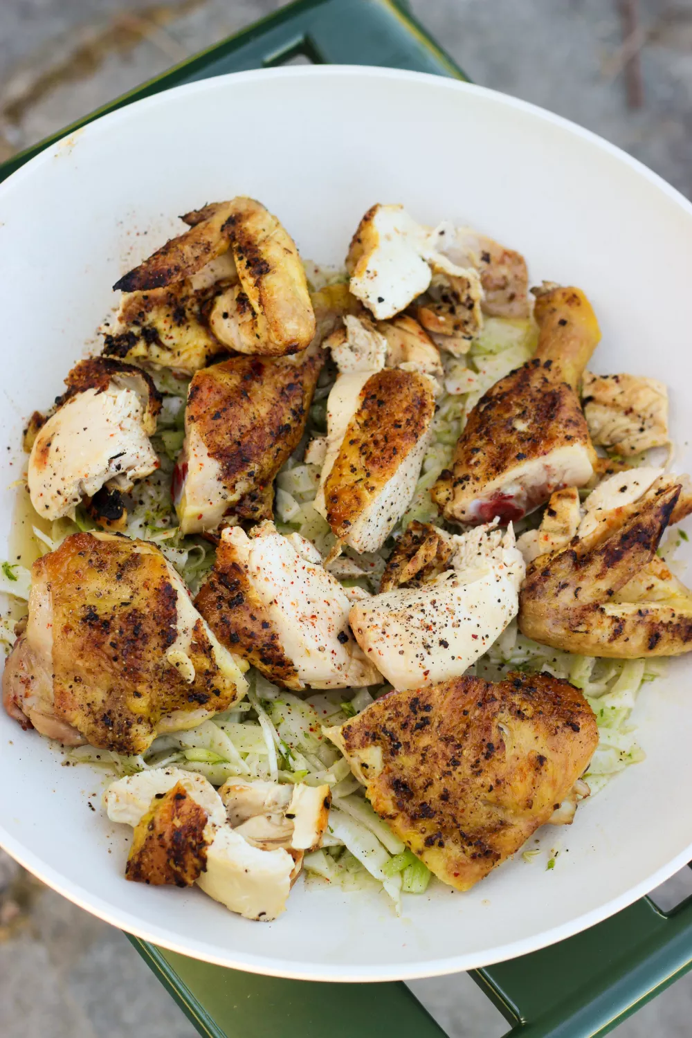 Doe de venkelsalade in een schaal. Haal de kip van de barbecue en versnijd ze in stukken. Leg de stukken bovenop de salade alvorens te serveren.