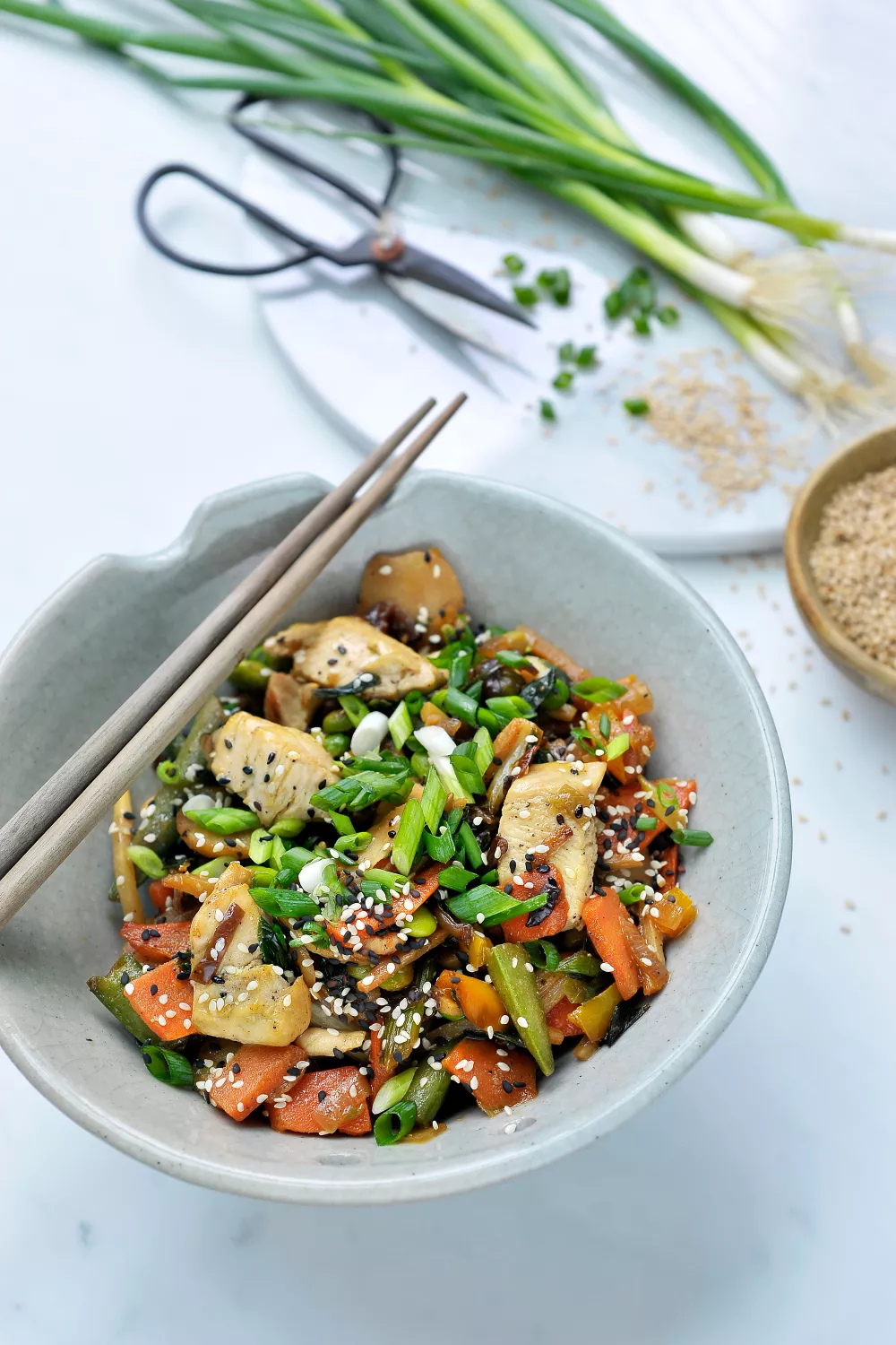 Schep de groenten en de kip in borden. Werk af met de fijngehakte lente-ui en de sesamzaadjes.