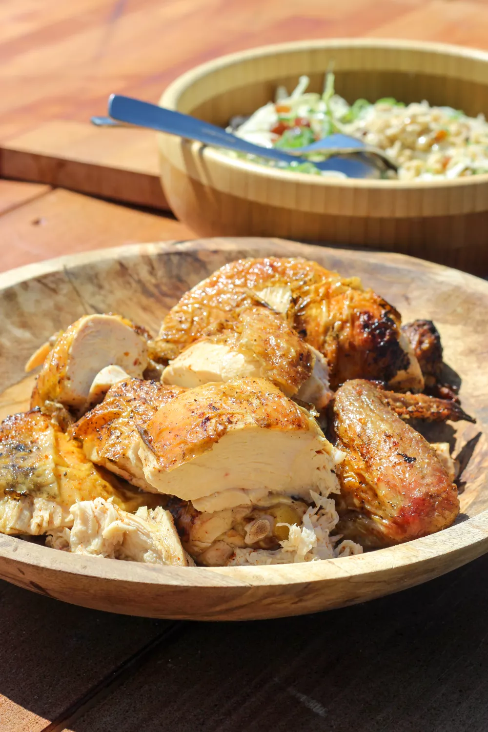 Haal de kip van de barbecue, verwijder het blik en snijd de kip in stukken. Serveer de kip met de witte koolsalade.