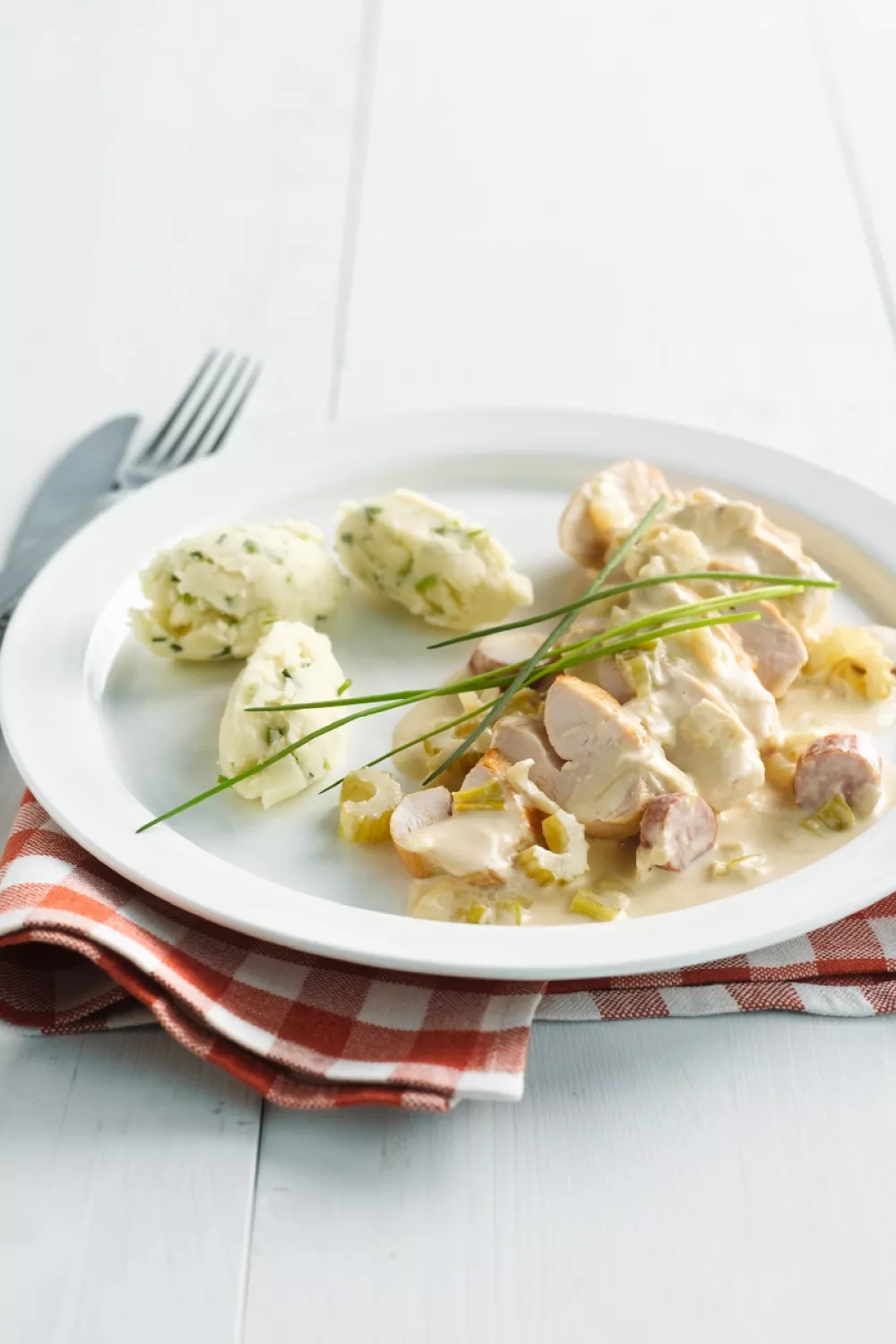Snijd de kip in schijfjes en overgiet met de saus. Serveer samen met de puree.
