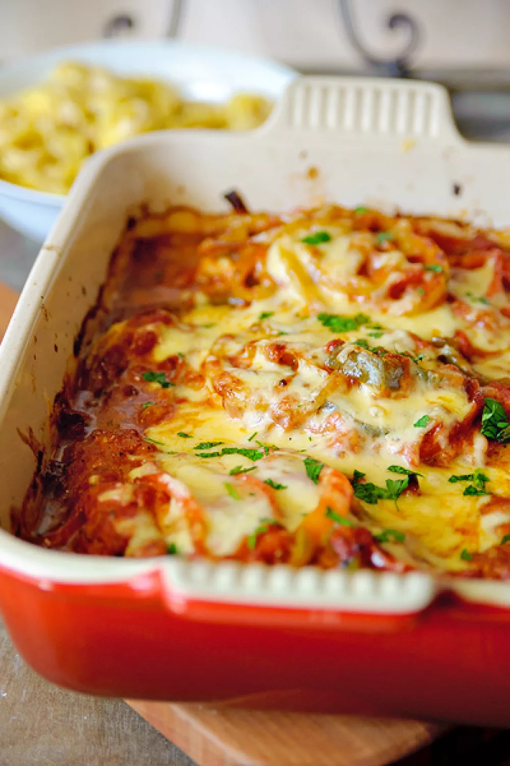 Deze romige ovenschotel met kipfilet krijgt een goudbruin kaaskorstje en barst van smaak door paprika, ui, tomaten en knoflook. Eerst kort aanbraden, daarna laten sudderen in een kruidige roomsaus met Italiaanse kruiden en tot slot gratineren in de oven. Perfect voor een doordeweeks familiediner in de herfst of winter, heerlijk comfort food bij pasta of grof brood.