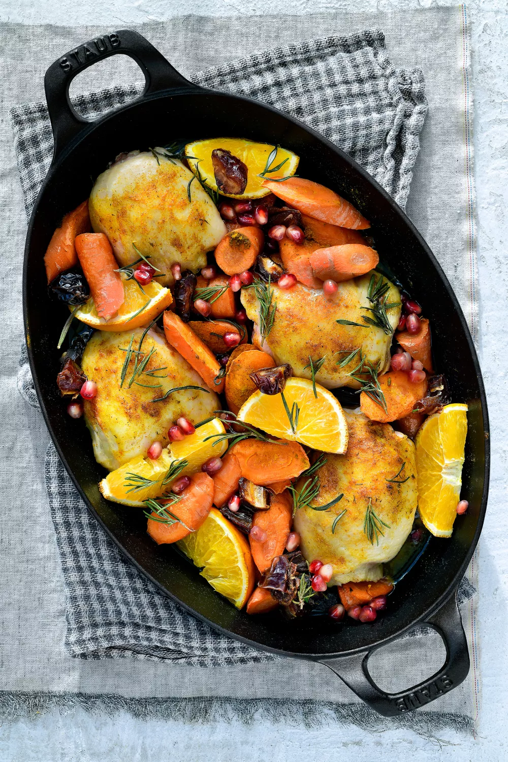 Zachte kippendijen uit de oven met zoete dadels en frisse sinaasappel geven een warme Marokkaanse toets aan je tafel. Met ras el hanout, rozemarijn en geroosterde wortelen ontstaat een geurige, kruidige schotel die perfect samengaat met couscous of bulgur, ideaal voor een herfstige maaltijd of een feestelijk diner. Simpel in de oven gegaard en afgemaakt met knapperige granaatappelpitjes.