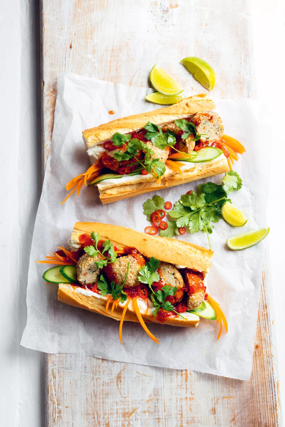 Besmeer de stokbroodjes met mayonaise. Verdeel de komkommer, wortel, gehaktballetjes, extra koriander en rode peper erover. Dien op met een extra scheutje chilisaus en partjes limoen.