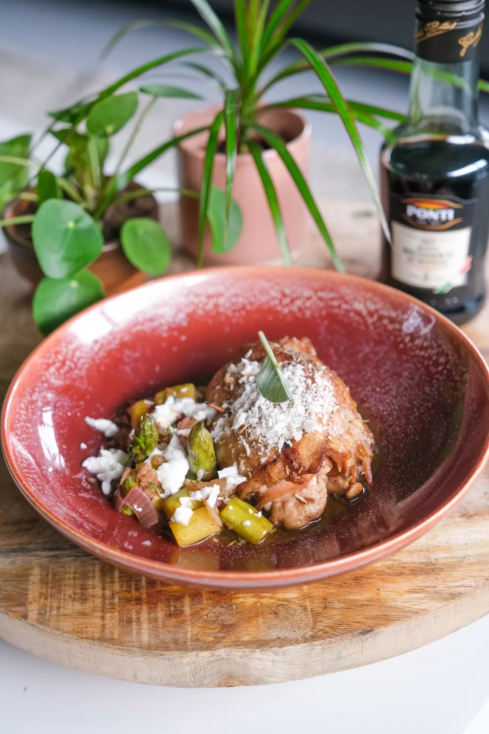 Deze sappige kippenrollade met groene asperges, gesmolten mozzarella, natuurham en een krokant laagje panko combineert braadwerk en ovengaring met een frisse balsamicowijnsaus. De kip wordt eerst dichtgeschroeid in de pan en daarna in de oven afgebakken terwijl een saus van rode ui, aspergepunten en witte wijn snel op smaak komt. Ideaal voor een lenteavond of feestelijk weekendetentje met Mediterrane invloeden.
