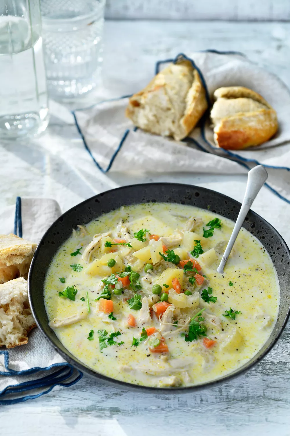 Een romige kippensoep met kipfiletreepjes, aardappelblokjes, wortel en knapperige selderij die je keuken vult met de warme geur van tijm en laurier. De groenten worden kort gefruit en vervolgens zachtjes geprutteld in kippenbouillon, afgewerkt met volle room en erwtjes voor een frisse toets. Perfect als snelle doordeweekse maaltijd of troostmaaltijd in herfst en winter, geserveerd met knapperig brood en verse peterselie.