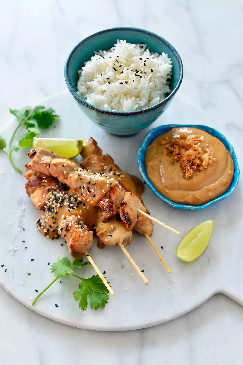 Serveer de kipsatés samen met de pindasaus en de rijst. Werk af met sesamzaadjes, krokante uitjes, koriander en limoen.