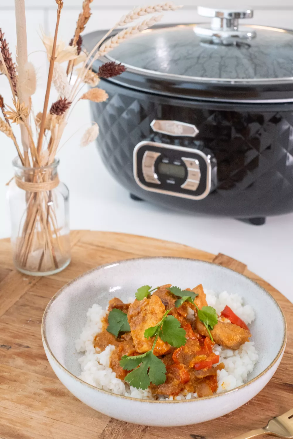 Doe de kip samen met alle andere ingrediënten in de Fritel slowcooker. Meng goed onder elkaar en laat 4 uur garen.