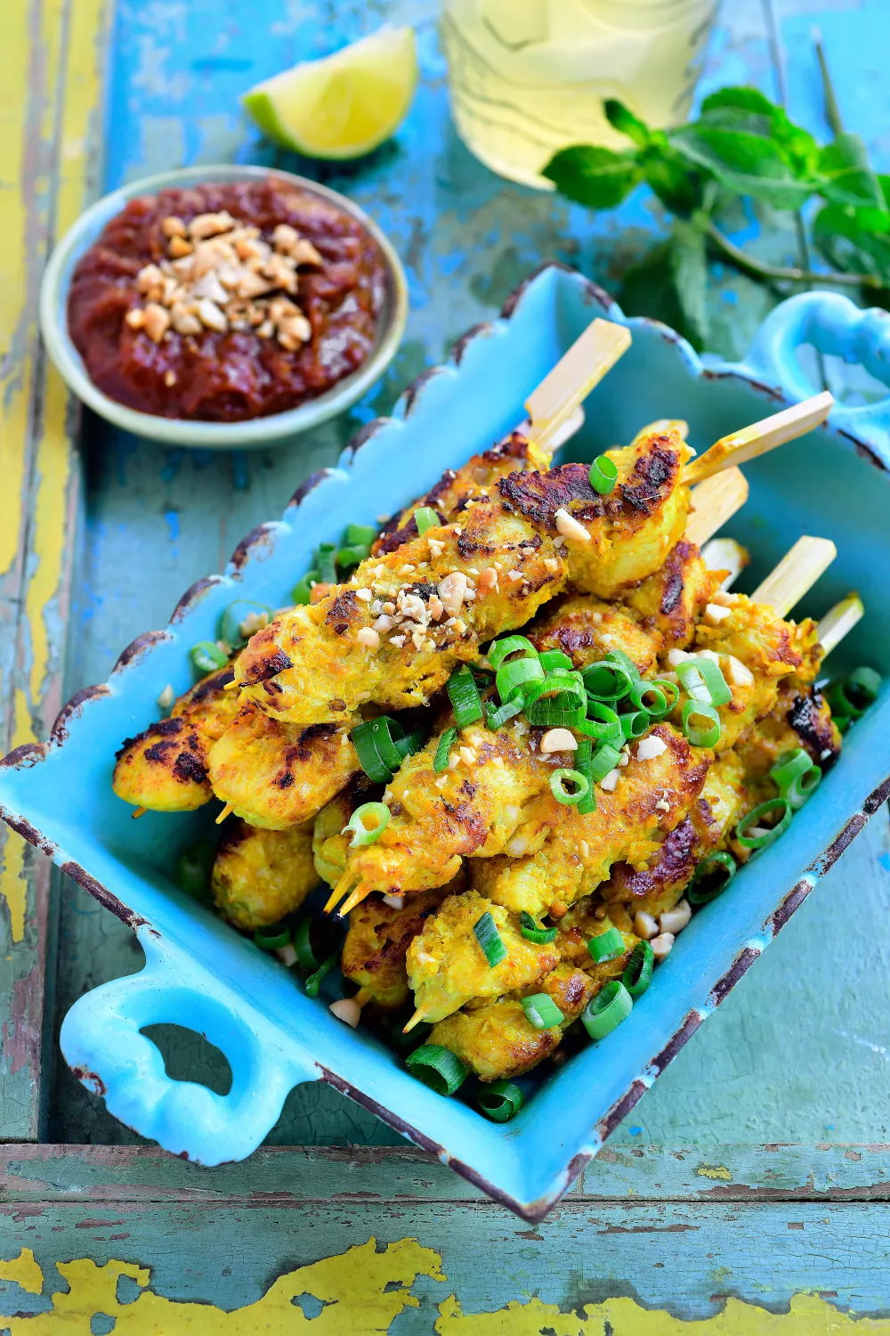Eetlustopwekkende kipspiesjes met romige satésaus: malse kippendijen worden gemarineerd met een in de blender gemaakte pasta van citroengras, knoflook, kurkuma en honing en vervolgens gegrild of gebakken tot goudbruin. De pindakaas met rode currypasta geeft de saus een volle, licht zoete en pittige smaak die uitstekend past bij een zomerse BBQ, borrel of doordeweekse maaltijd. Makkelijk, snel en vol Aziatische smaken.