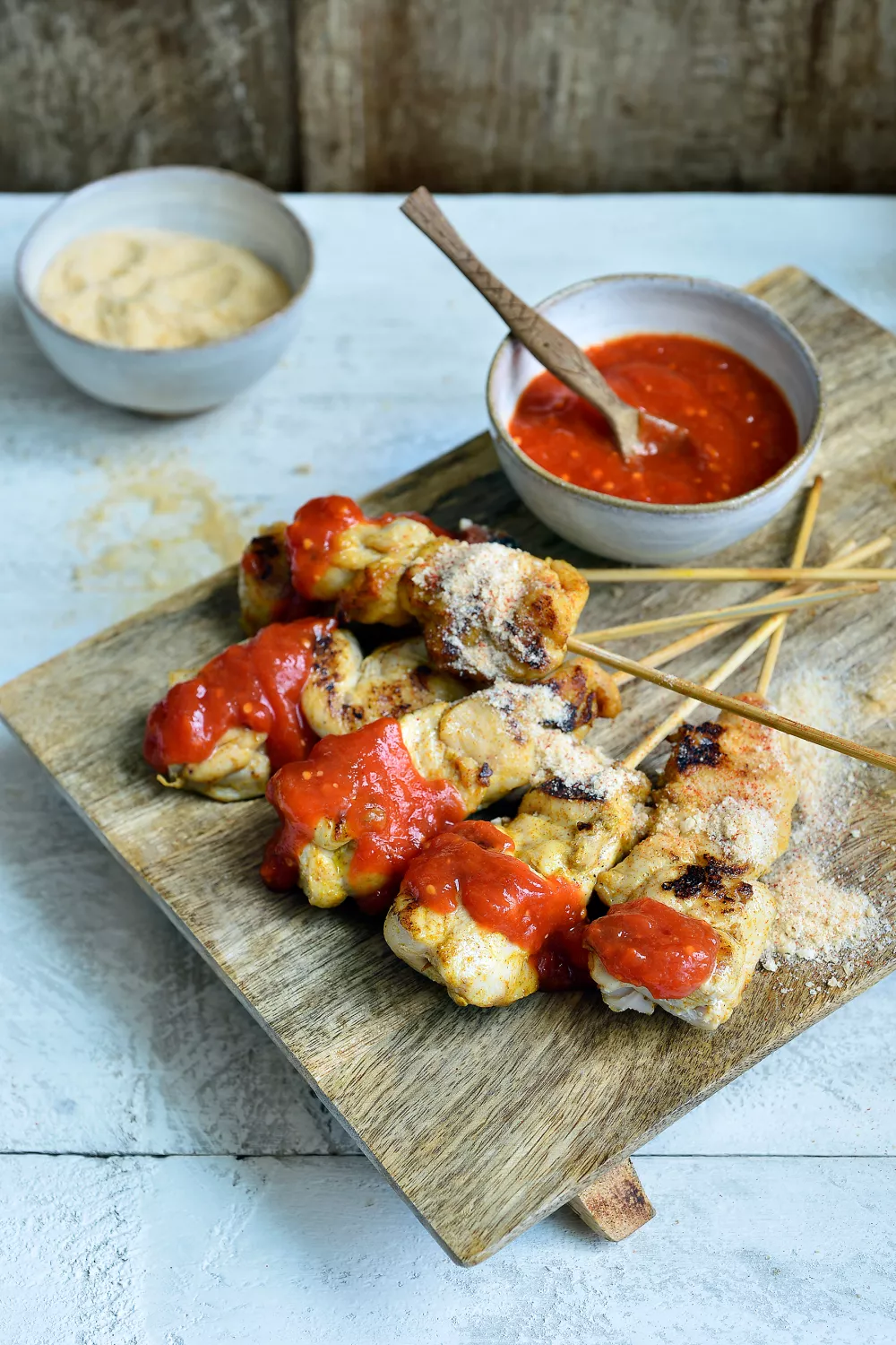 Snijd de kipfilets in lange reepjes en steek ze op een houten stokje. Kruid met paprikapoeder, currypoeder en cayennepeper.