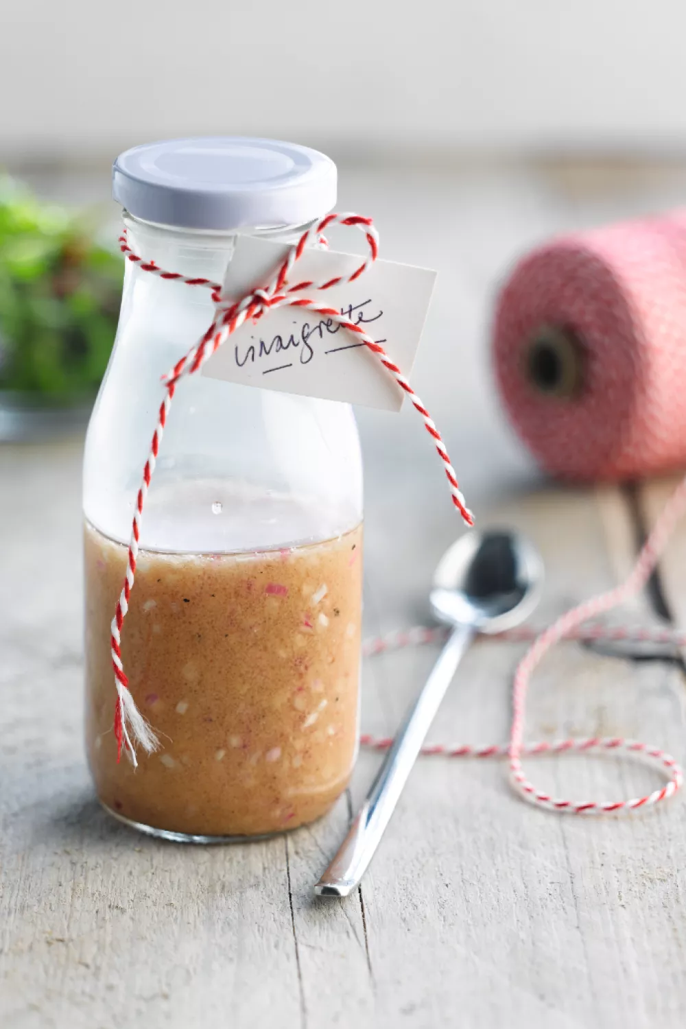 Een klassieke mosterdvinaigrette met rode wijnazijn, zonnebloemolie en fijngesneden sjalot geeft frisse, pittige smaak aan lente- en zomersalades of als eenvoudige dressing bij gegrilde groenten. Door mosterd en azijn los te roeren en de olie geleidelijk toe te voegen ontstaat een zijdezachte emulsie in enkele minuten. Afwerken met peper en zout en eventueel kappertjes, bieslook of extra vergine olijfolie voor een zuiders accent. Bewaar gekoeld in een afgesloten pot en schud voor gebruik.