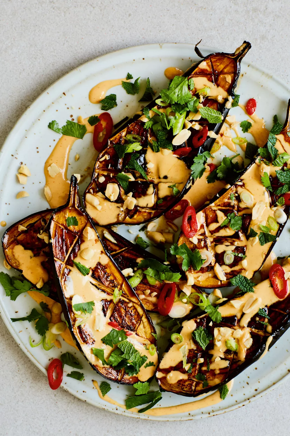 Deze kleverige gegrilde aubergines met romige pindasaus combineren zoet, pittig en umami tot een feestelijk vegetarisch hoofdgerecht. Door de aubergines eerst onder de grill te schroeien en daarna in de oven te roosteren krijgen ze een zachte, bijna jamachtige structuur die de marinade van sojasaus, ahornsiroop en sriracha goed opneemt. Bestrooi met krokante pinda's, verse koriander, munt en lente-uitjes voor kleur en frisheid, heerlijk als doordeweekse maaltijd of om te delen bij een zomerse borrel.