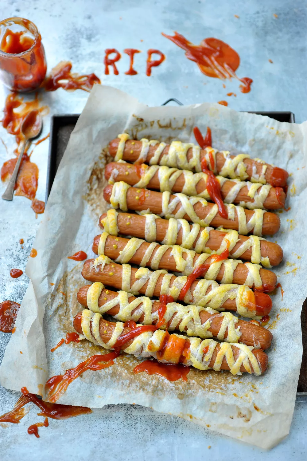 Laat de worstjes een klein beetje afkoelen en teken dan met mosterd twee oogjes. Serveer de mummieworstjes met ketchup als bloederige saus!